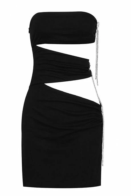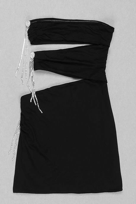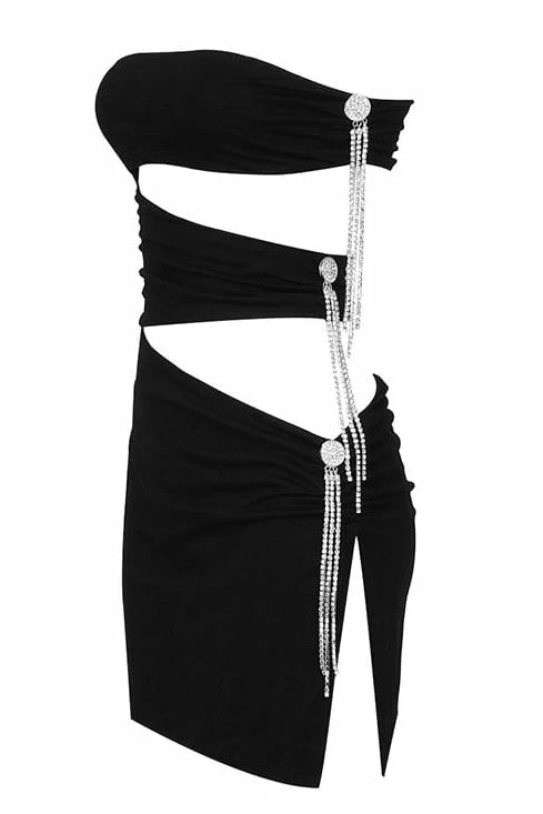 This mini will have all eyes on you! Featuring a strapless mini dress with side cut outs, crystal fringe detailing, and a leg slit. Just add strappy heels and a crystal clutch for your next night out with the dolls!