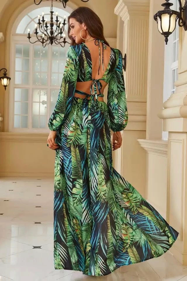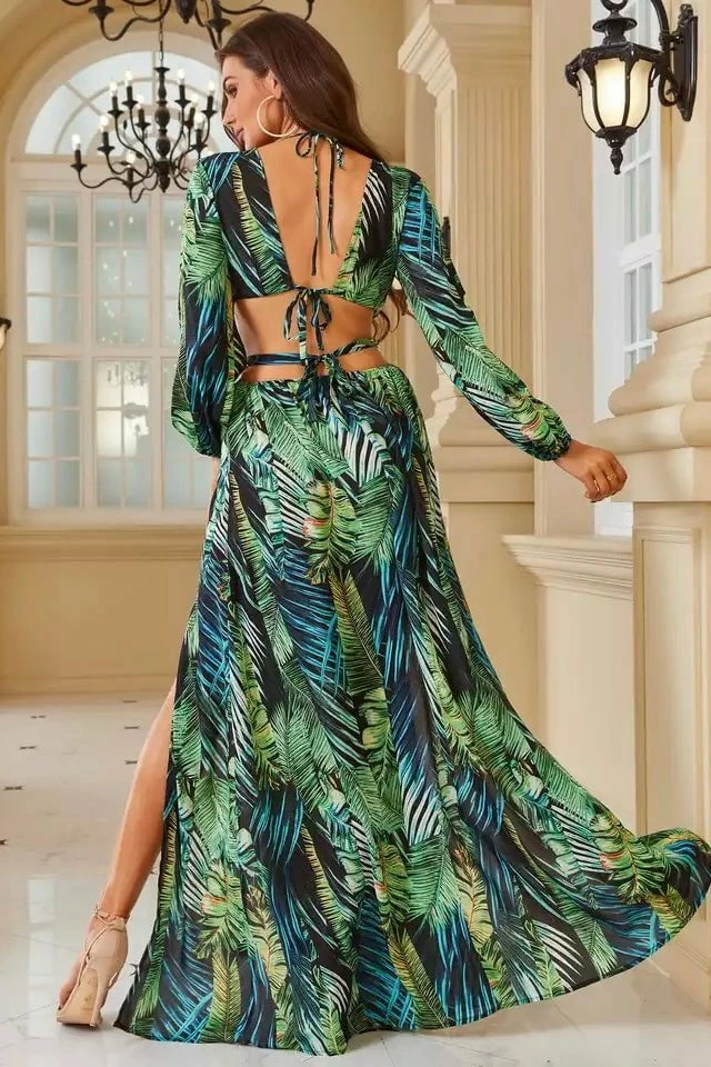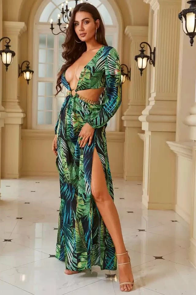 This maxi dress features a long sleeves, double slit, plunged v-neck, cut out chain detail and a beautiful tropical print. Wear it with your hottest heels for a stunning and sexy night out on your next vaca!