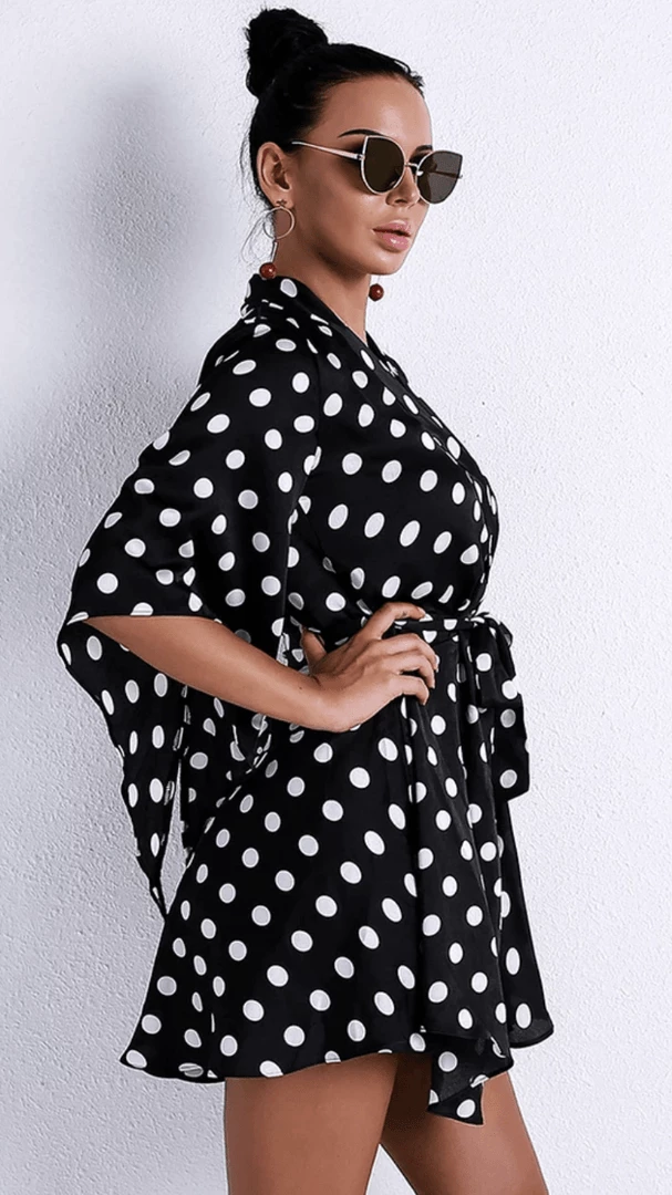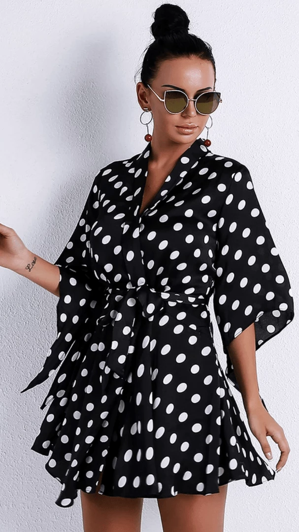 This polka dot mini dress will give you all of the retro vibes you have been looking for! With a waist-cinching belt, a comfy satin material, and 3/4th length sleeves, you will be all set for your next occasion. Team this with sky-high heels and large sunglasses to feel extra fabulous.