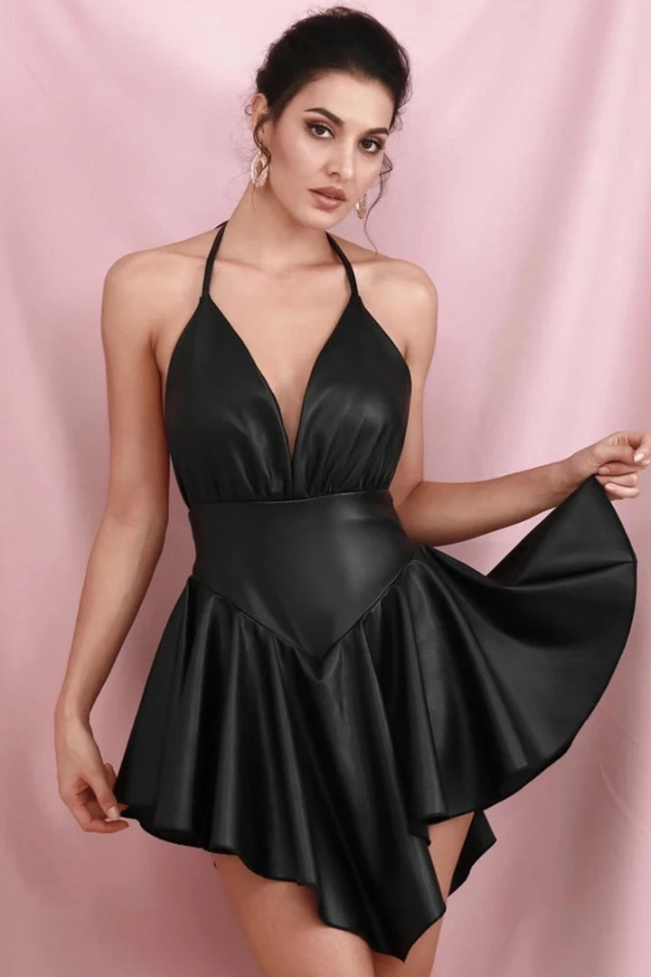 This flirty mini features a PU material, spaghetti straps, open back, ruffle details, and mini length. Pair with tousled waves and strappy heels!