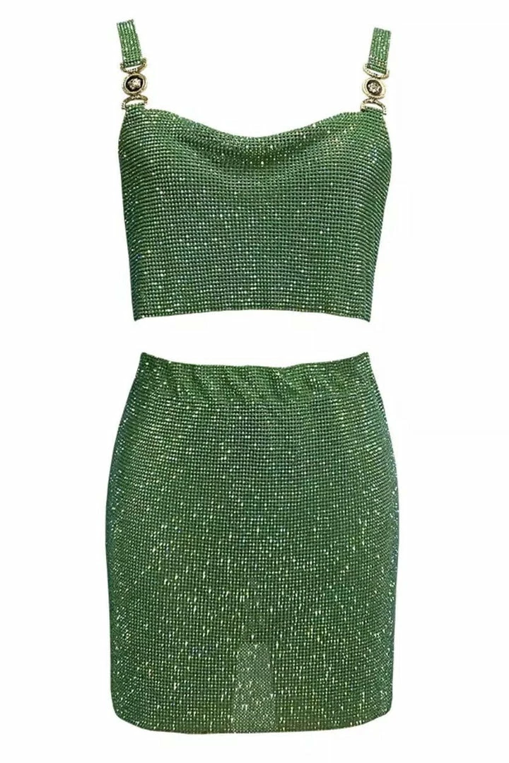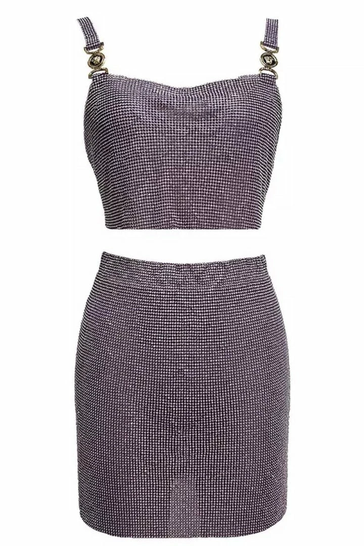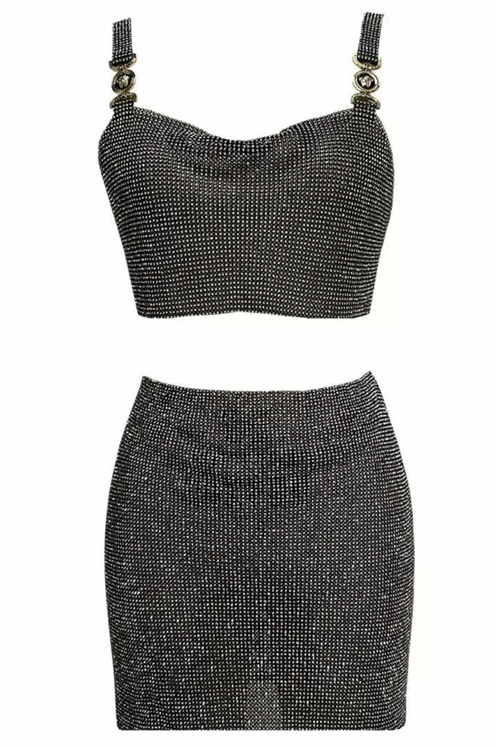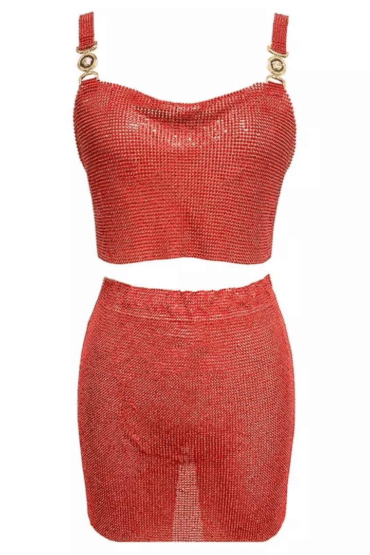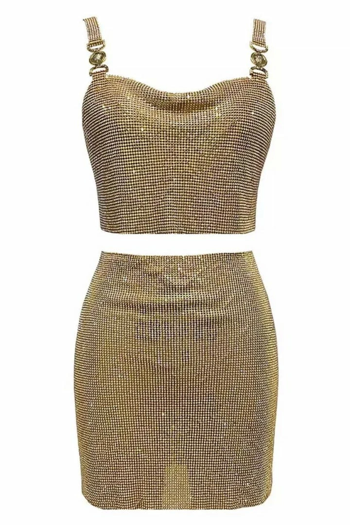 Go glitter or go home! This two piece set includes a tank, crop top featuring a gold detailed strap and rhinestone chainmail material with a matching high waisted skirt. Style with gold necklaces and strappy heels for the party perfect fit!