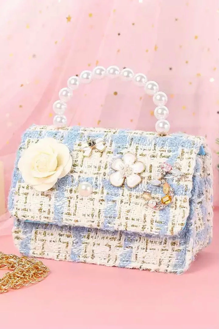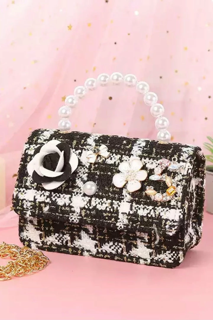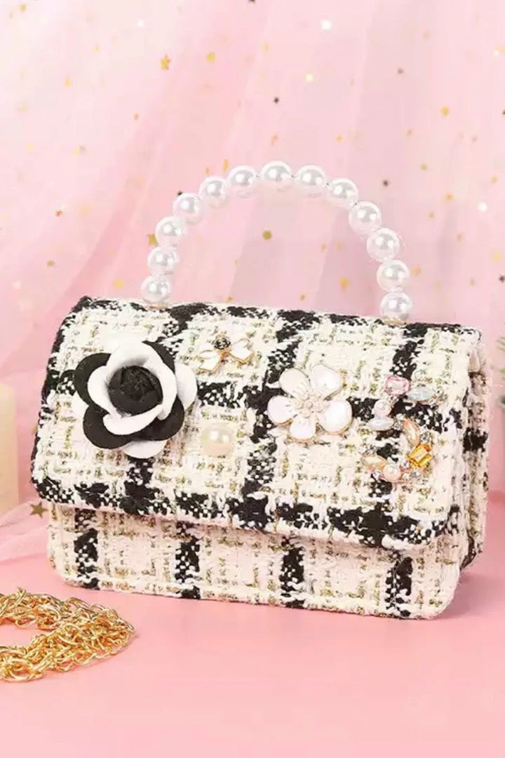 This micro crossbody bag will have you looking totally chic! Featuring a tweed material with floral charms, a pearl strap, and a gold chain. Throw over any outfit for a preppy look.
