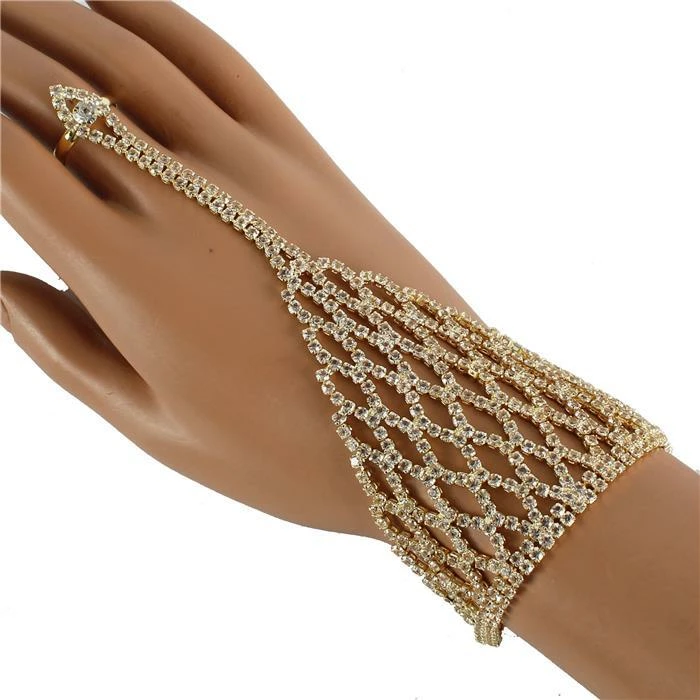 Bling up your style with this gorgeous hand piece covered in rhinestones with fasting around the wrist and finger. Add some bling with a dress on your next night out!