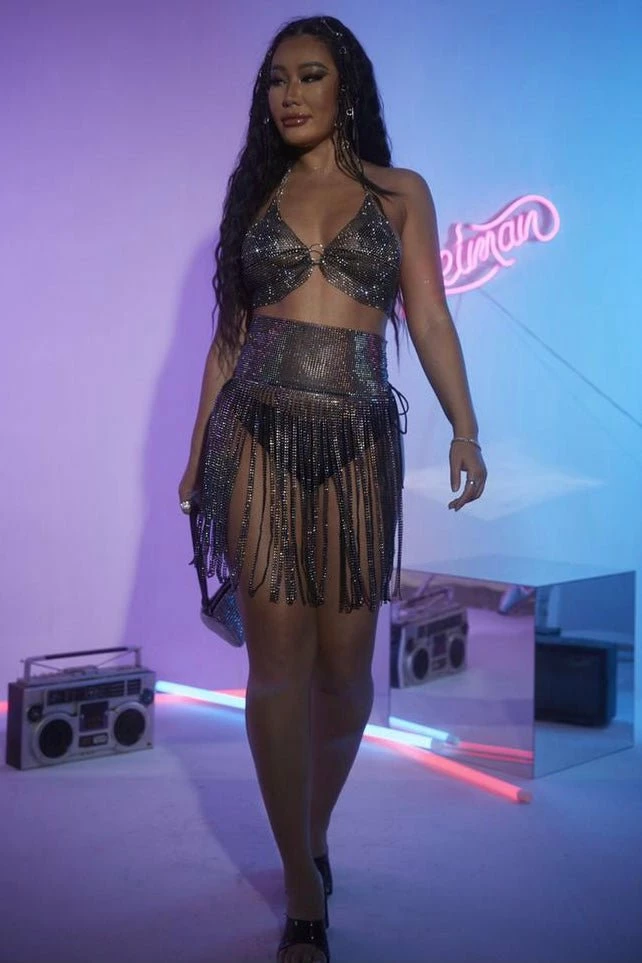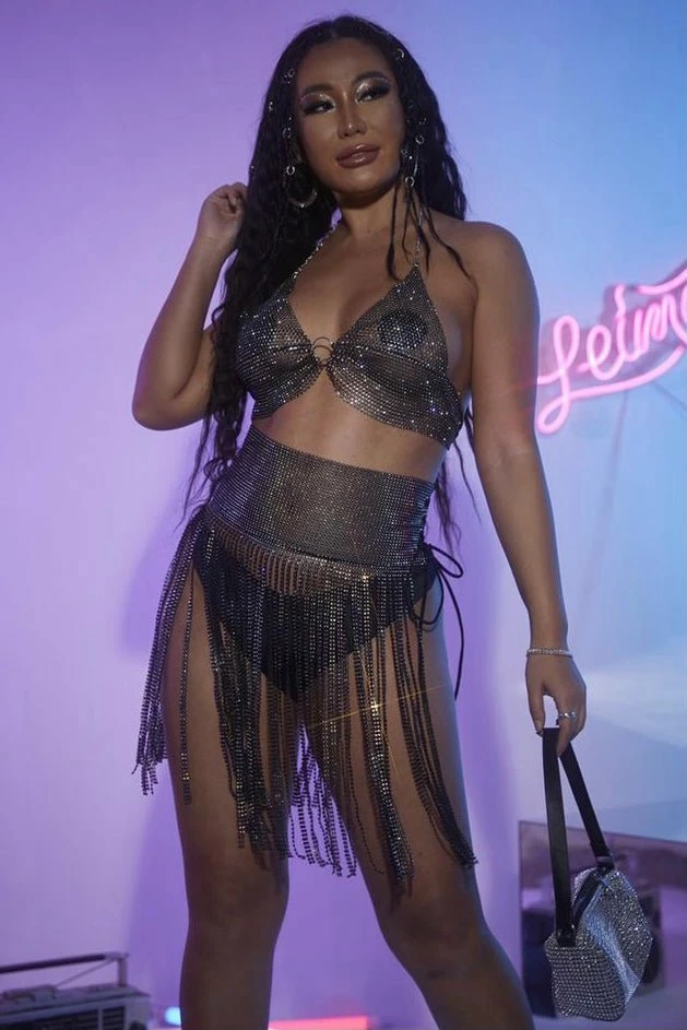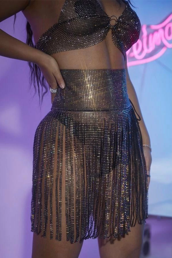 Festival season is here and we have an outfit just for you! This two piece set features a halter bra top with rhinestone mesh material and a matching skirt with fringe tassels and a high waisted band. Style over black or bright colored undergarments and a crystal bag to finish off the look.