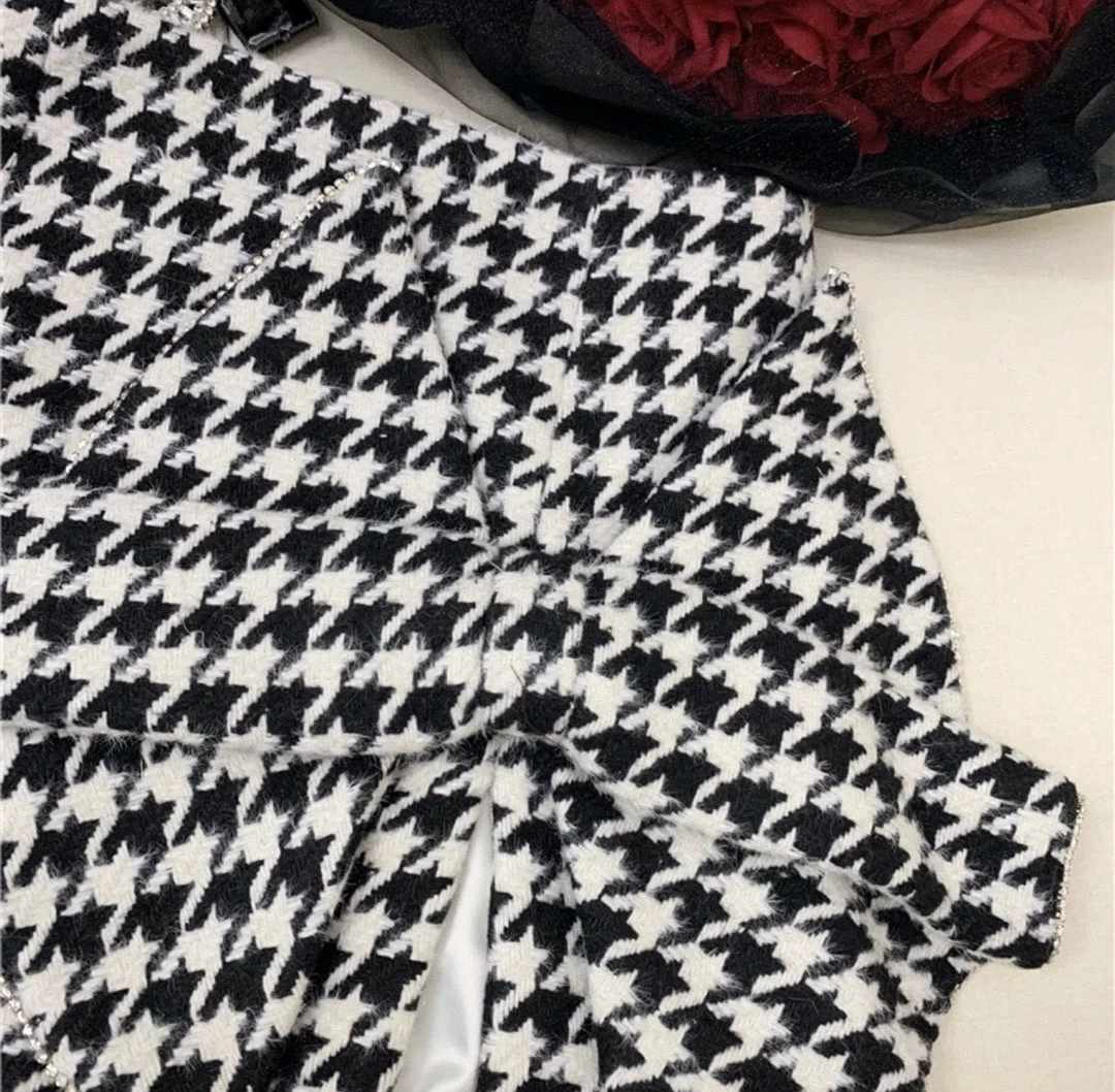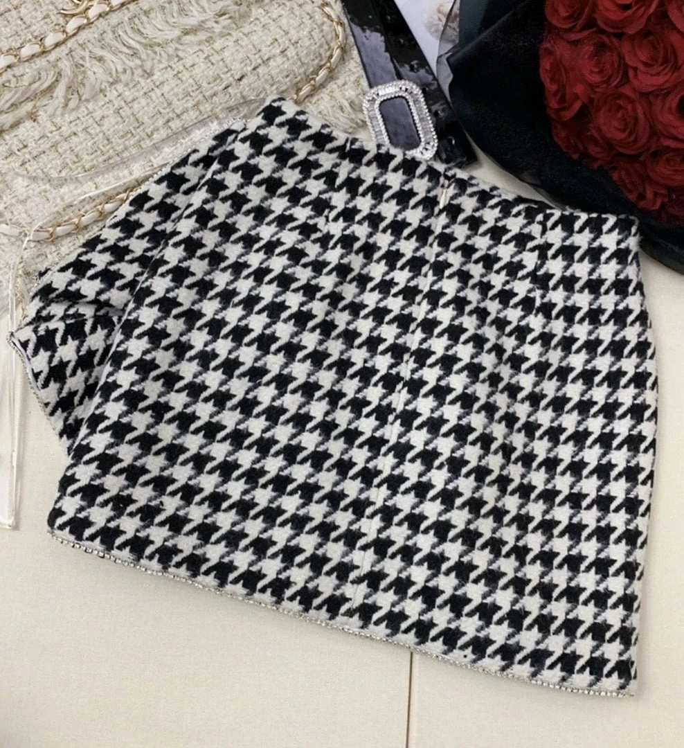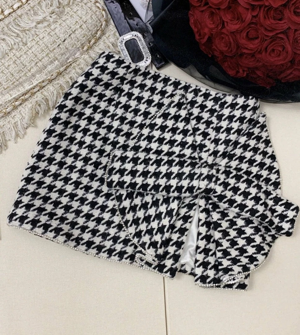 Dolls, we are obsessing over everything houndstooth! This skirt features a high-waisted fit, bow detail, side slit, and mini length. Pair with a bodysuit and heels for your next date night.