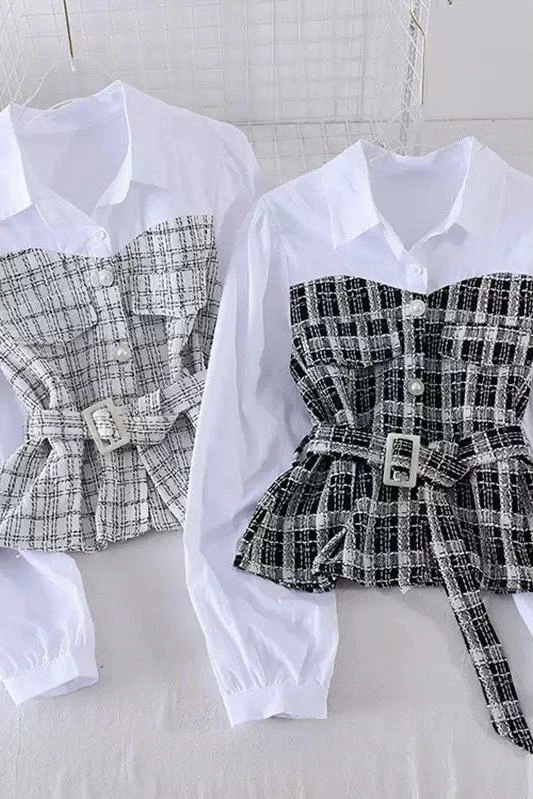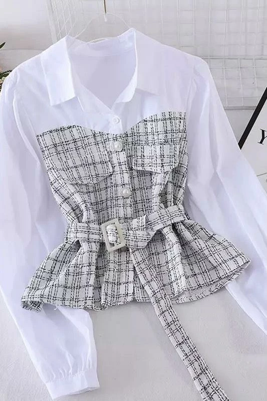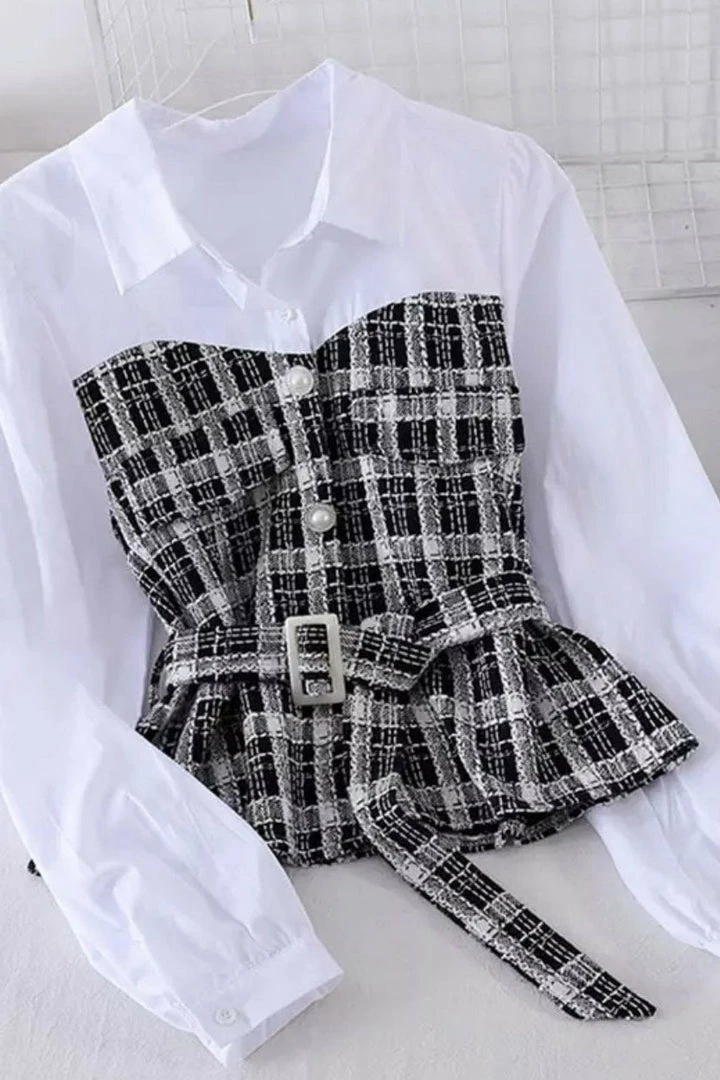 This perfect classy blouse! Featuring a white shirt collar and sleeves, and an attached plaid bustier with a belt, pockets, and pearl buttons. Pair with flare pants and heels for a trendy business look.