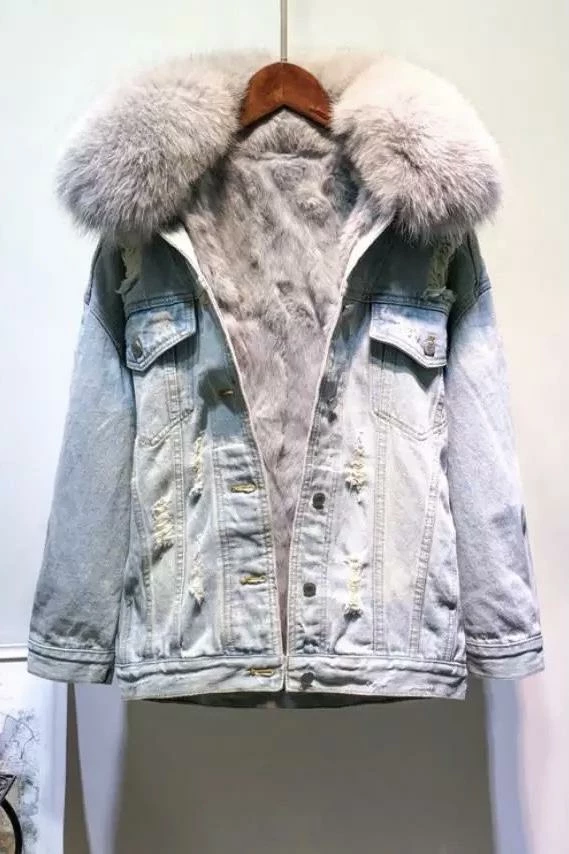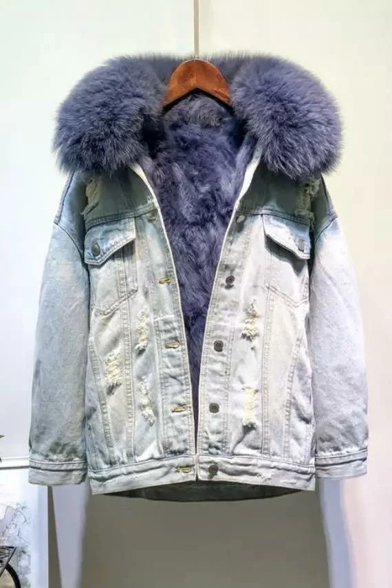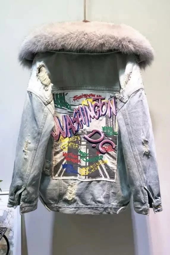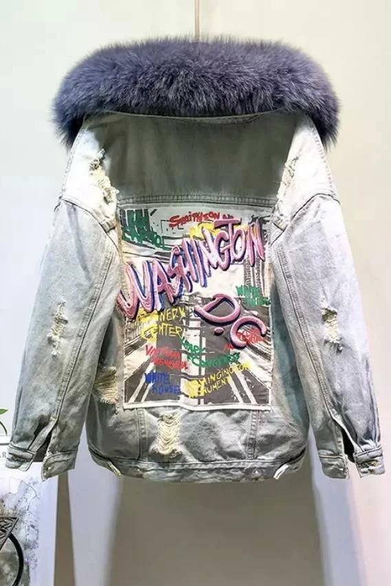 Rock this graphic denim and fur coat for the chilly season. Featuring a ripped, distressed, light wash, denim jacket with a fur collar and inner lining, side and breast pockets, and a Washington D.C. embroidered graphic on the back. Look effortlessly cool while you run your errands this winter.