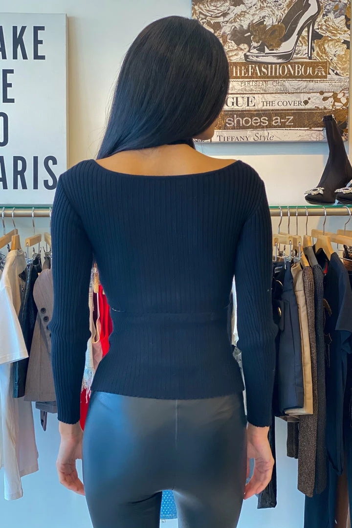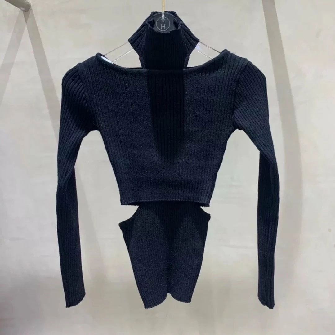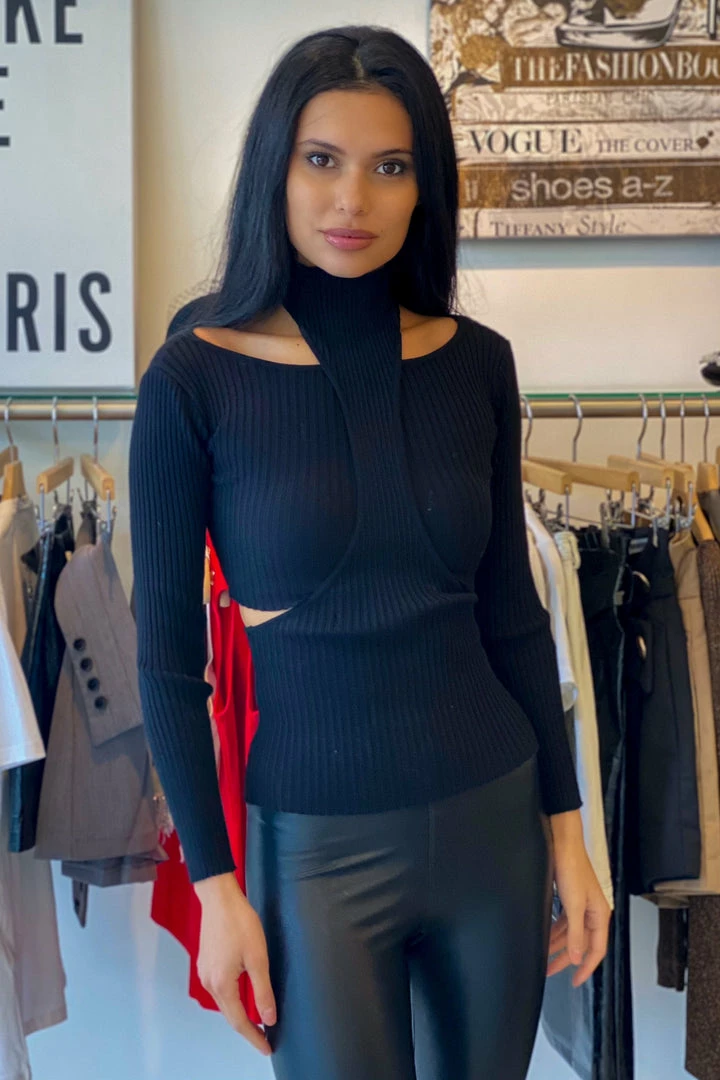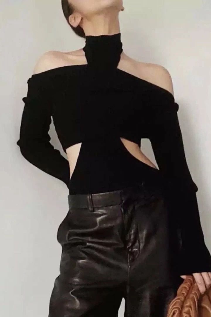 Spice up your top game with this eye-catching piece! Featuring long sleeves, knitted material, choker detail, cut outs, and off the shoulder style. Tuck this top into leather pants and booties for a killer look!