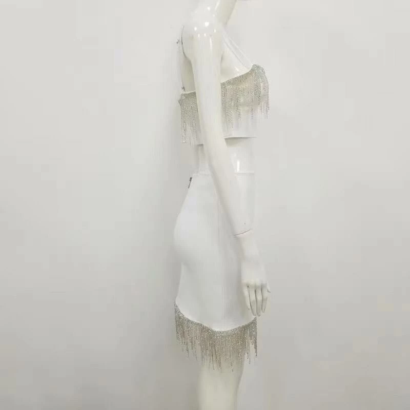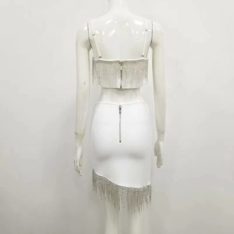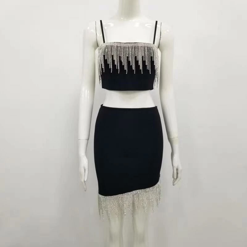 This unstoppable two piece set features a square neck cropped top with cami straps and a matching high waisted mini skirt decorated with diamond fringe tassels.