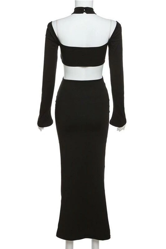Cut it out! This super sexy maxi is the trendy look of the season. Featuring long sleeves, a high neckline, cut outs along the mid center, waist, and shoulders, and a bodycon maxi fit. Team with heels and a crop leather jacket to hit the bars with the dolls!