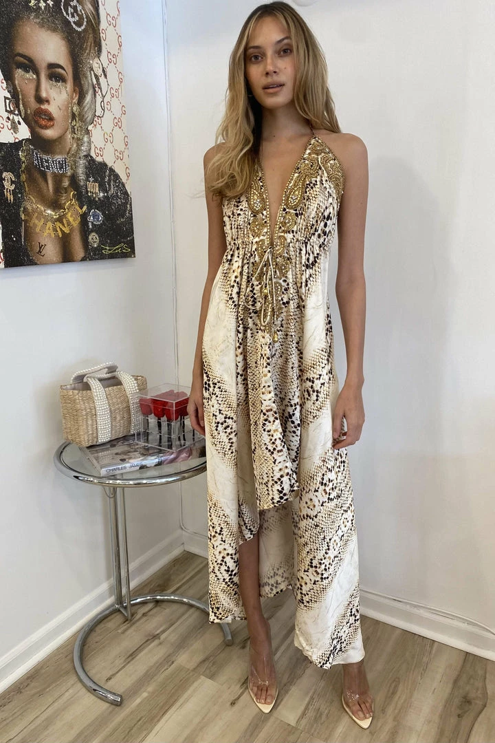 White Snake Skin Halter Maxi dress, with Hi low hem.