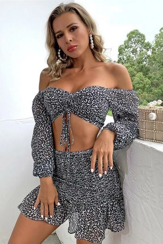 Let your wild side out in this black leopard two piece set. Comes with an off the shoulder lace up cropped top with long lantern sleeves and a matching high waisted smocked ruffle skirt. Team with other mule heels and a shoulder bag to complete the look.