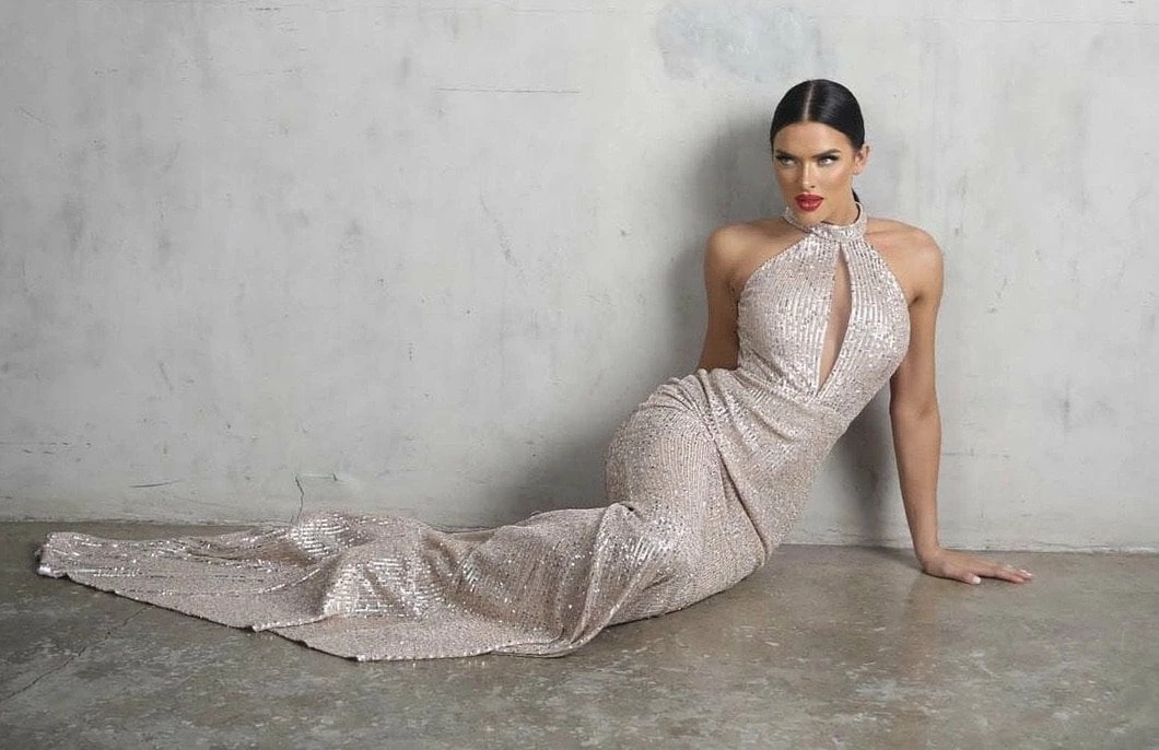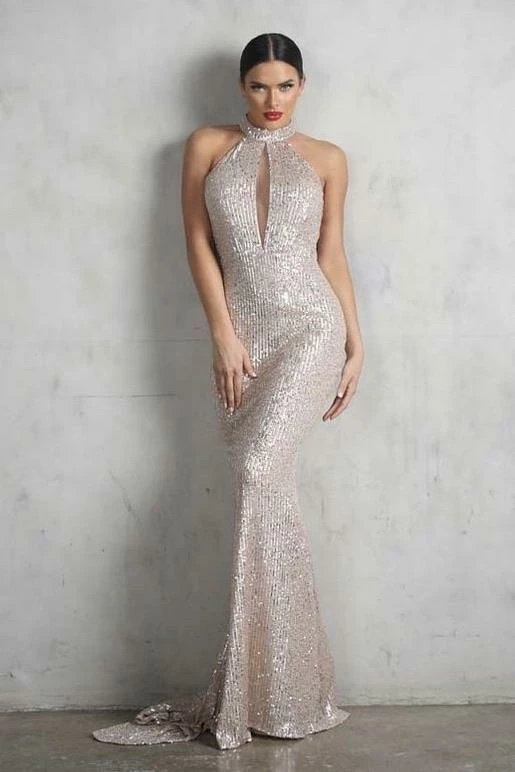 Timeless yet so stunning! This gown features a glitter material, high neckline, cut-out, backless detail, bodycon fit, and a floor length.