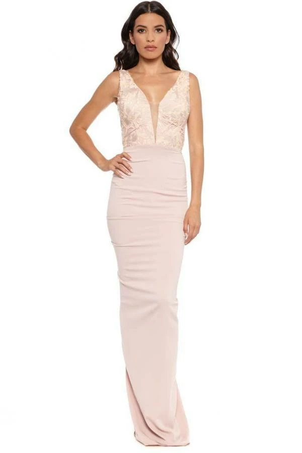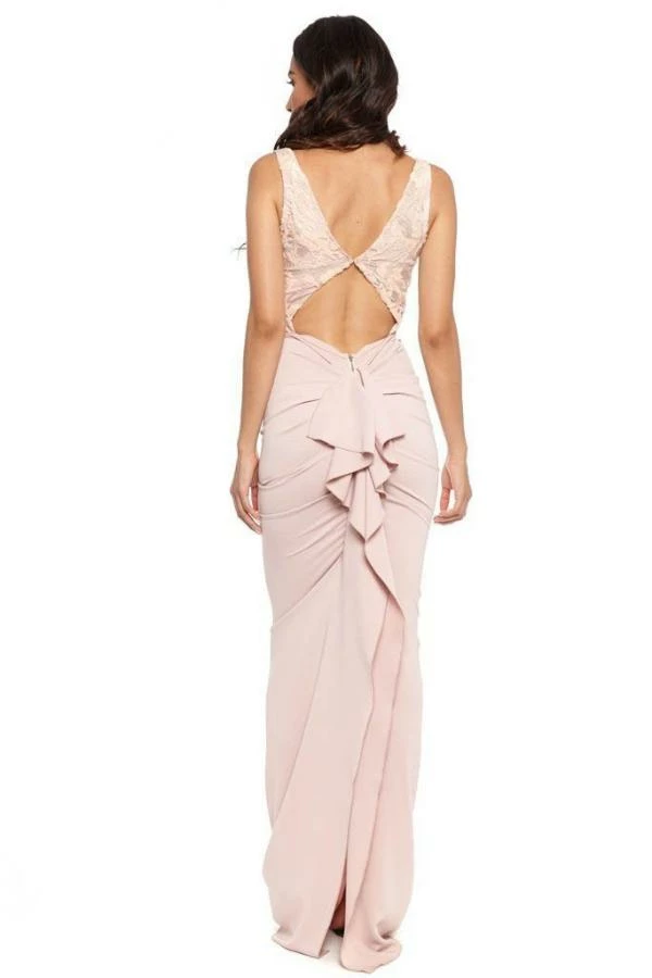 This Nicole Bakti cocktail dress includes a modest plunge neckline and peekaboo cutout in the lower back area and ruffle detail.