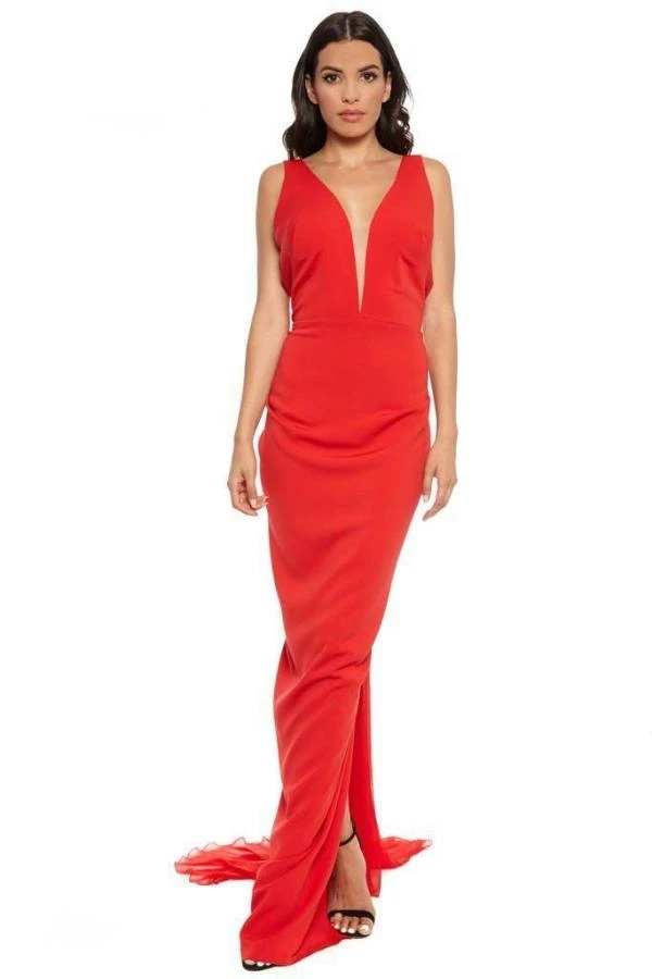 This dress includes a plunge neckline with a mid thigh slit and subtle plunge back.