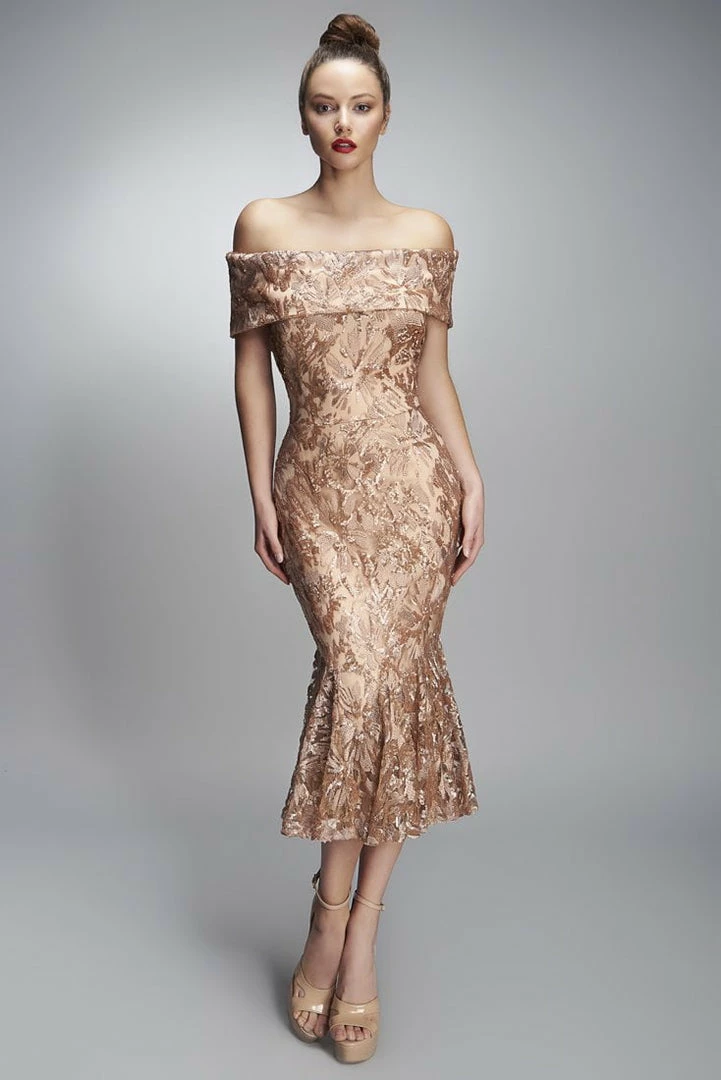 Off the shoulder embellished midi ruffled dress. Nicole Bakti Spring 2019 collection.