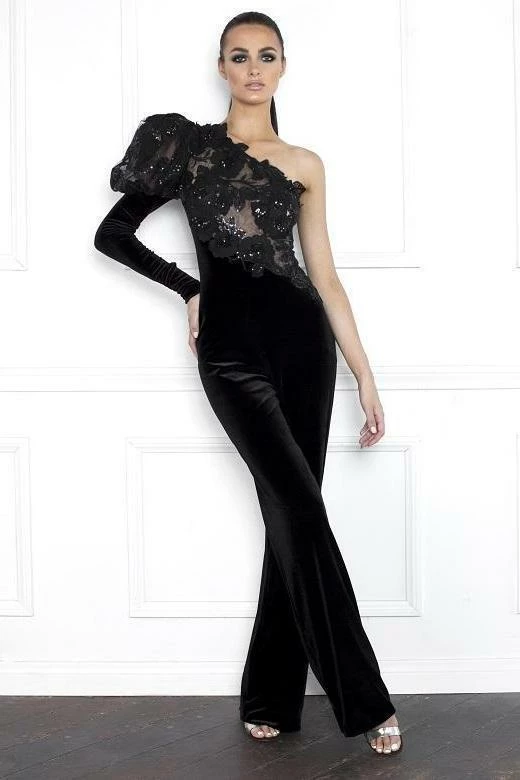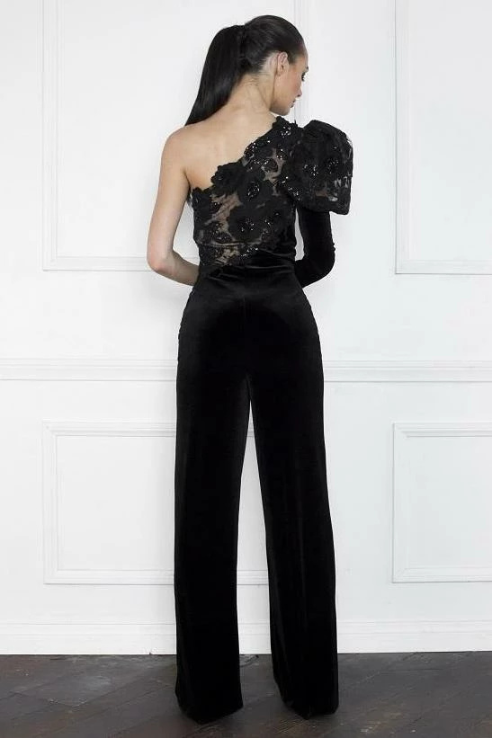 This Jumpsuit features a cross over neckline with a gold accent and small slit over the abdomen.