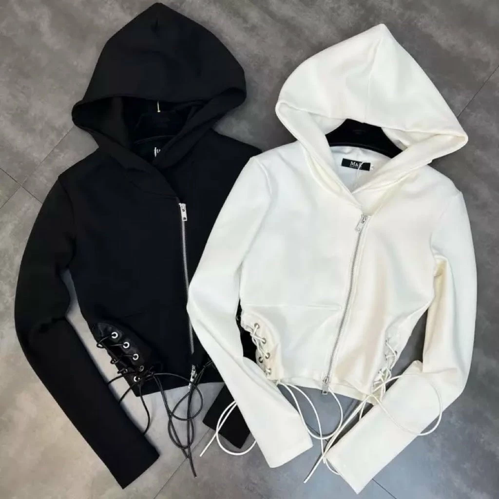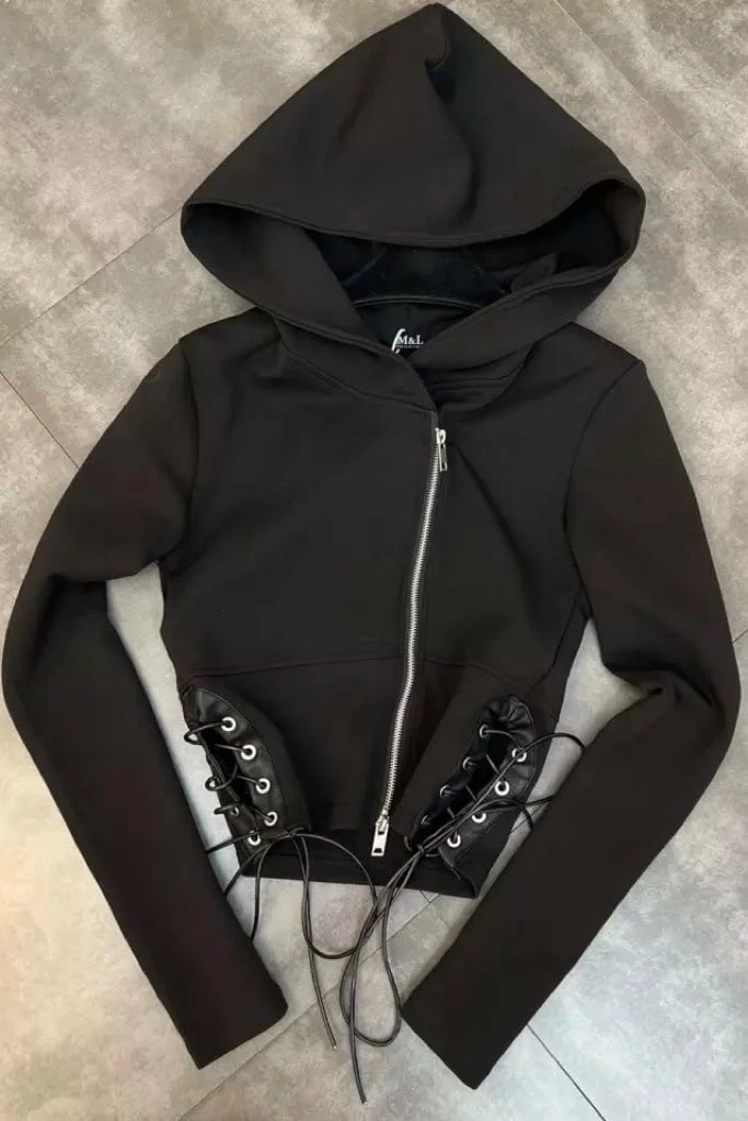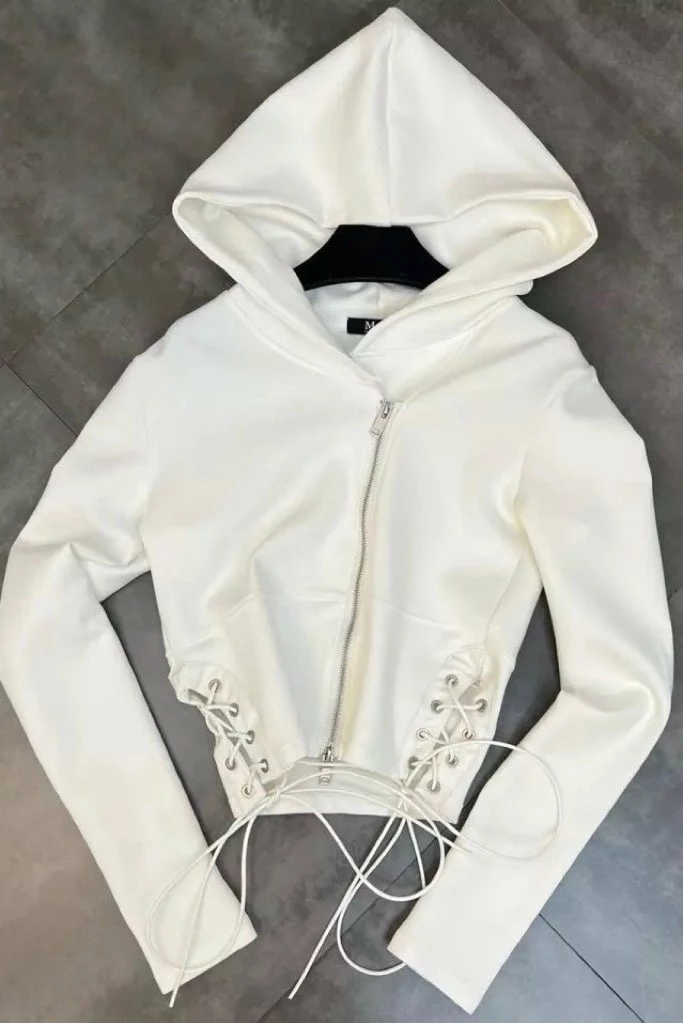 This hoodie is perfect for lounging around or running out! It features an asymmetrical zipper, a hood, and lace up side details. Pair with sweats and sneakers to look cool while being casual!
