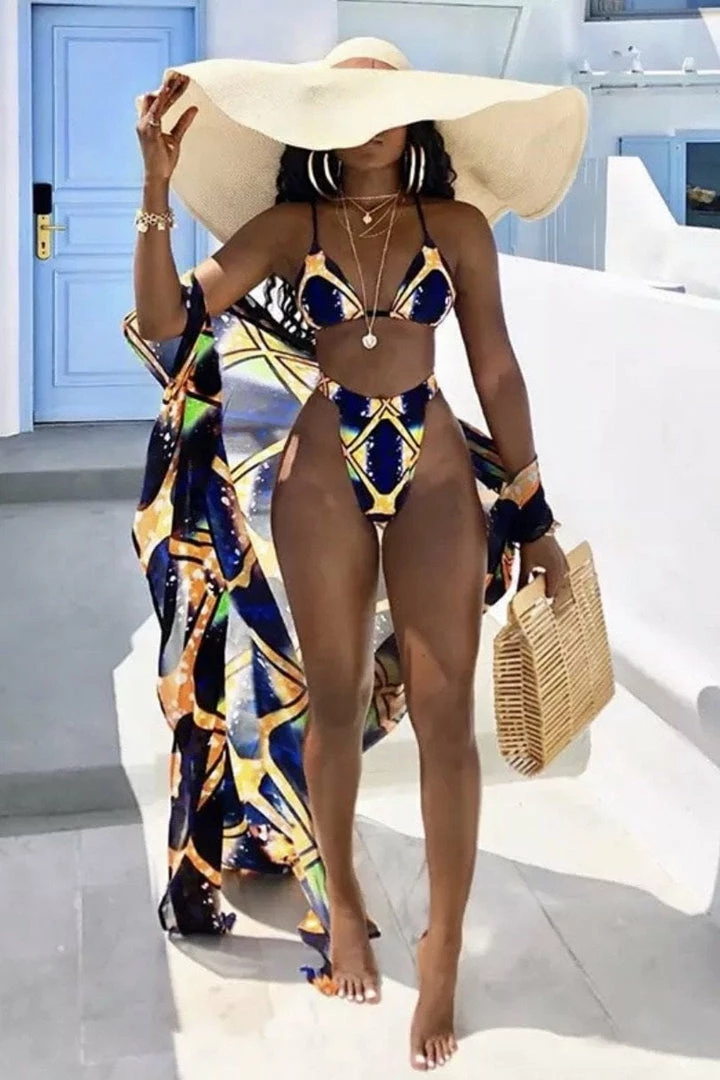 Look ultra fabulous in this bikini set! Featuring a retro printed material with a triangle top and matching high waisted bottoms. Pair with oversized sunglasses and a summer glow!