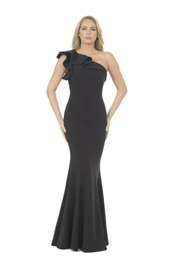 This floor length evening gown includes a ruffle accent one shoulder sleeve with a sleek mermaid fit.
