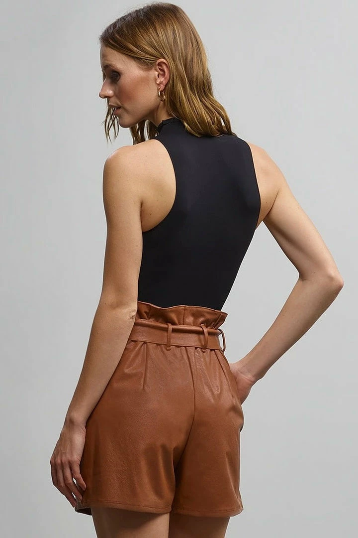 The Faux Leather Paper Bag Short is designed with a relaxed silhouette, a high-rise paperbag waist, and a removable tie-belt. Made from our signature four-way stretch faux leather fabric, this short is as comfortable as it is stylish.