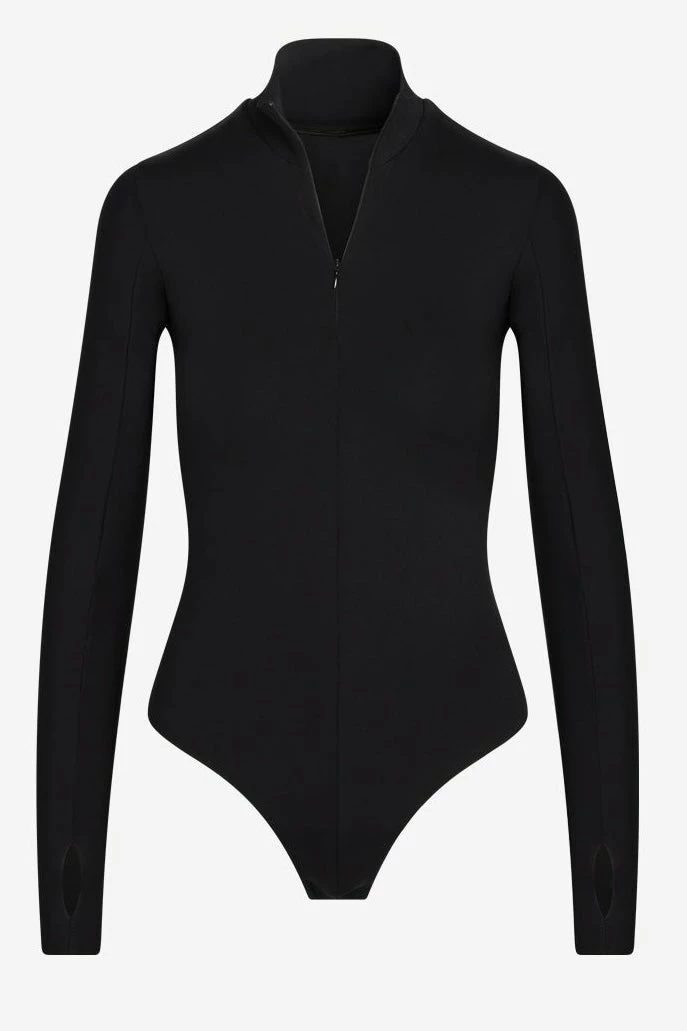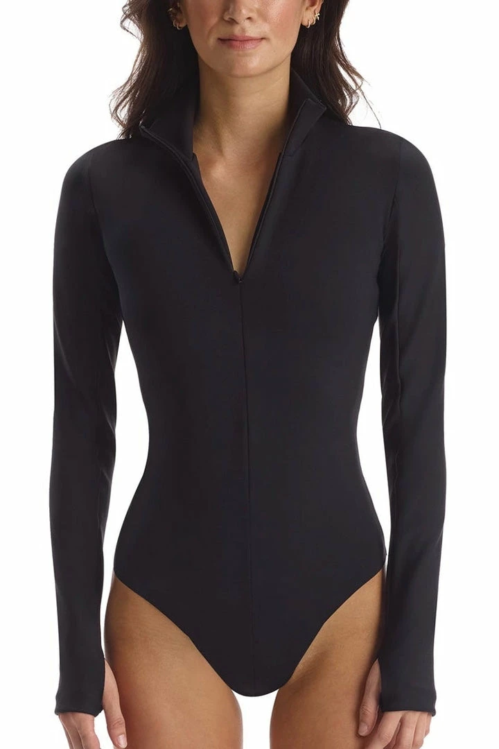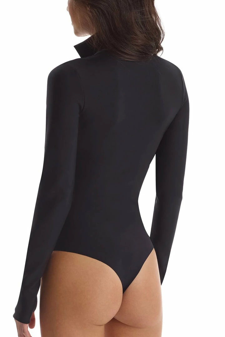 Our Neoprene Zip Long Sleeve Bodysuit is the definition of sporty chic. Made of a luxury-technical Italian Neoprene, this style is ultra-comfortable and machine washable. The bodysuit is finished with Commando’s signature raw-cut thong so you can add that sporty edge to any look.