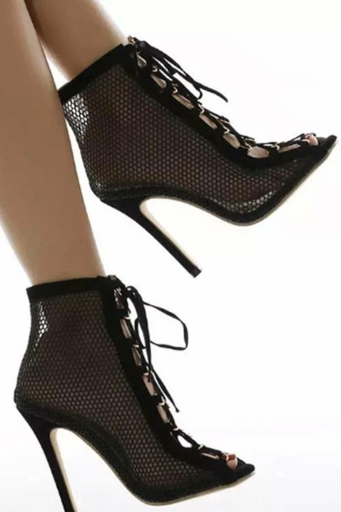 These lace up shoes feature a stiletto-like heel and have a mesh material. Wear with your favorite black bodycon dress or black jeans and a glossy lip for an unforgettable look!