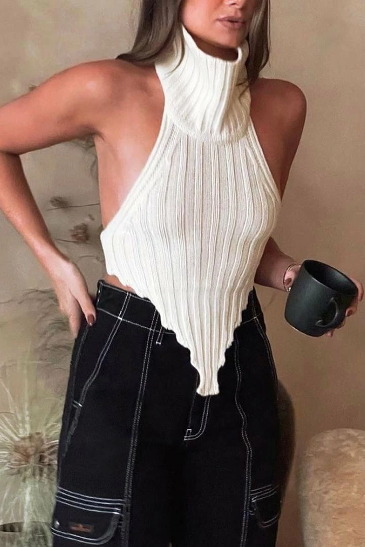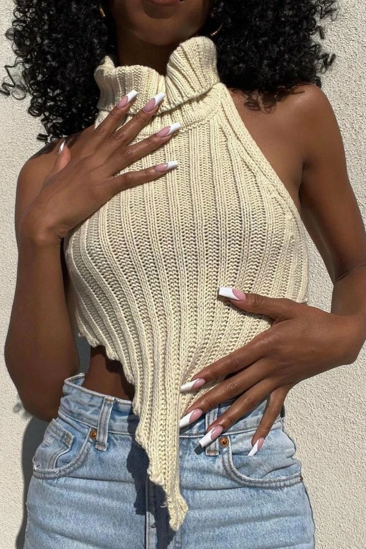 This top will have you look fashion forward. Featuring a sleeveless turtleneck design, a knit material, and high cuts along the sides. Style with a mini skirt and heels for your next chill night at the bar.