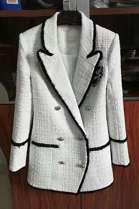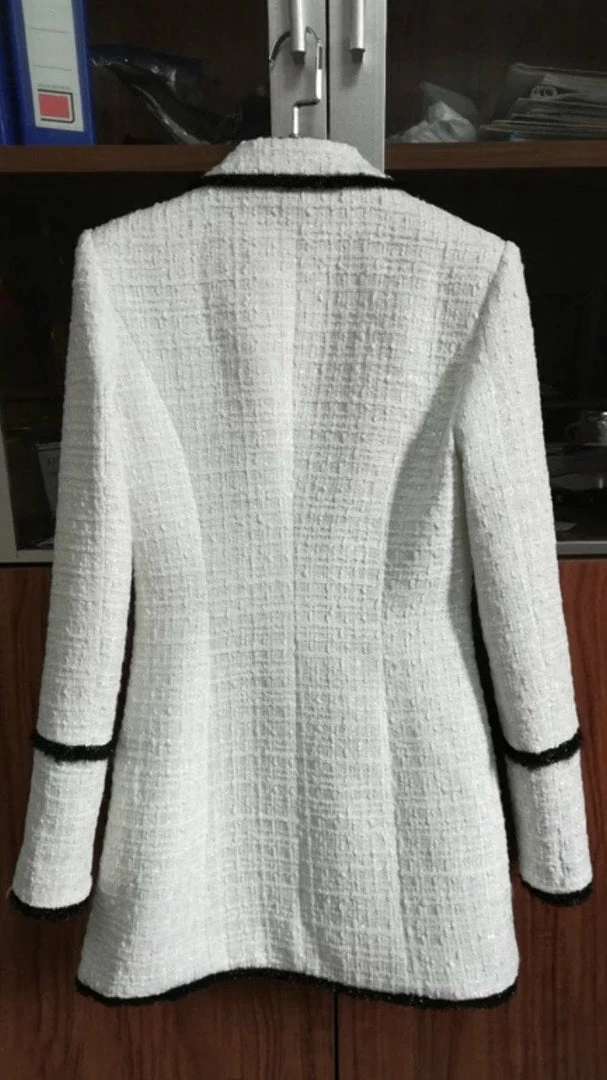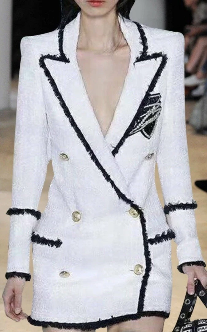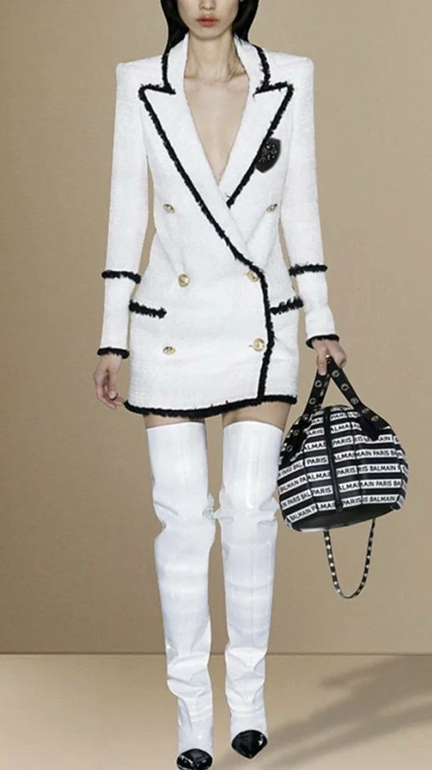 We are obsessing over our ‘Brenna’ blazer! Featuring a white color with a contrasting black lining, tweed material, sand silver button embellishments. Team this with a t-shirt and a mini skirt to complete the look, or wear as a dress with tights and heels!