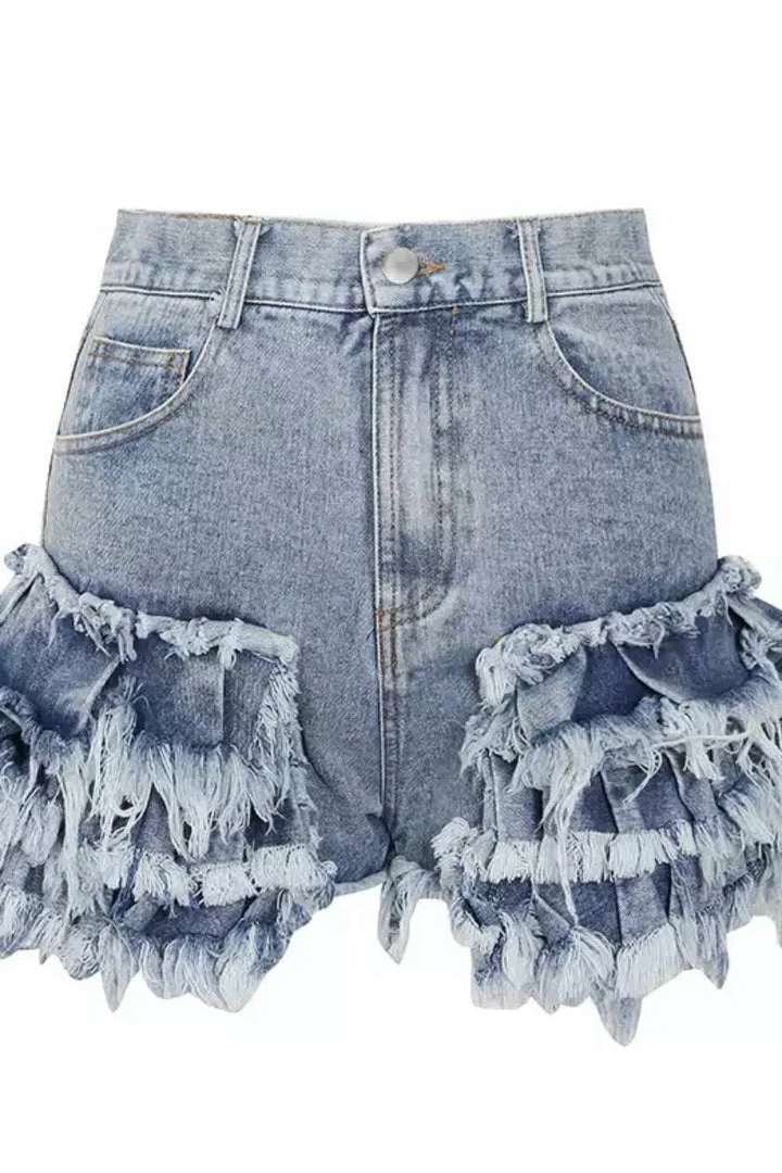 Add some frill to the basic denim short. Featuring a denim material, high waisted fit, ruffle and fringe detailing in the front and the back, pockets, and a button fastening. Pair these adorable shorts with a crop top and covers for a summer loving look!