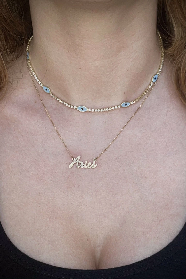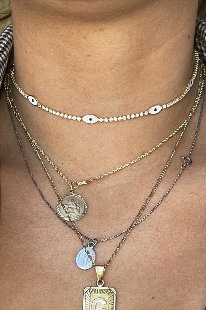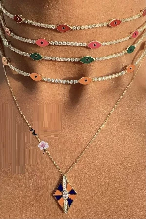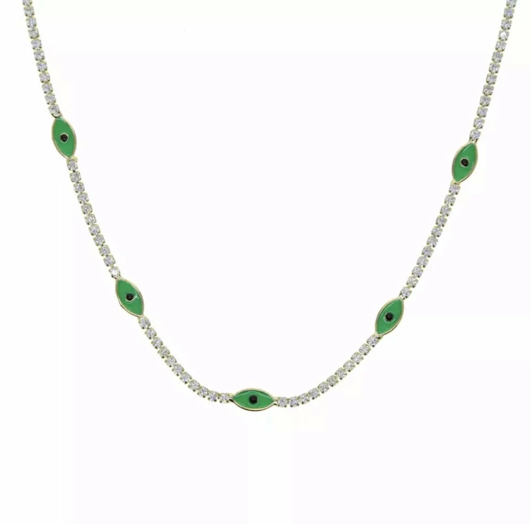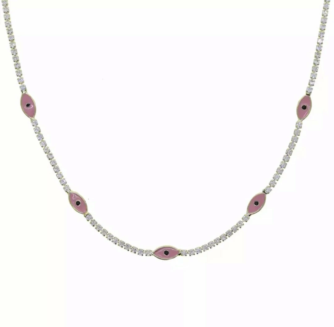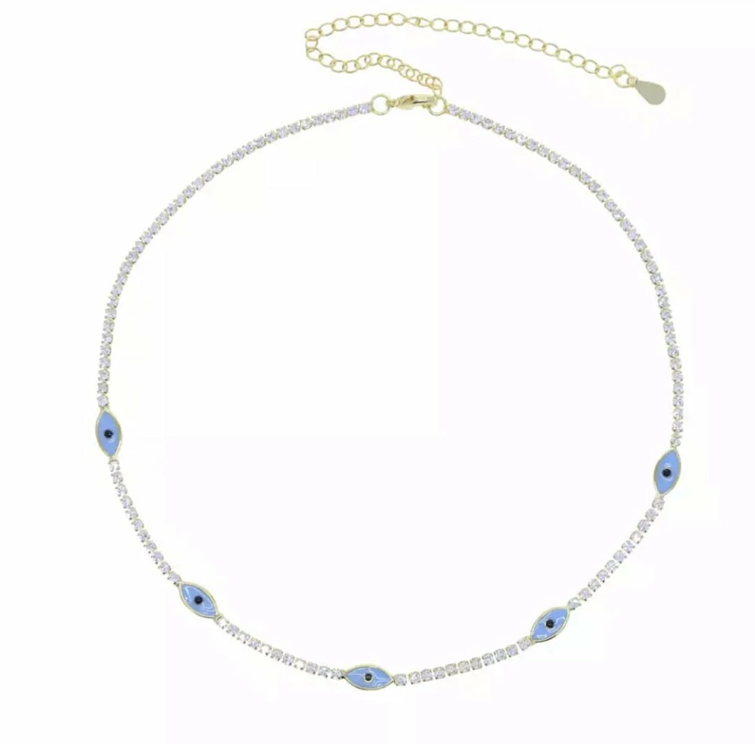 This necklace features 5 evil eye charms, crystal studs, and gold hardware. Layer this with your other gold necklaces this season for an adorable addition to your collection.