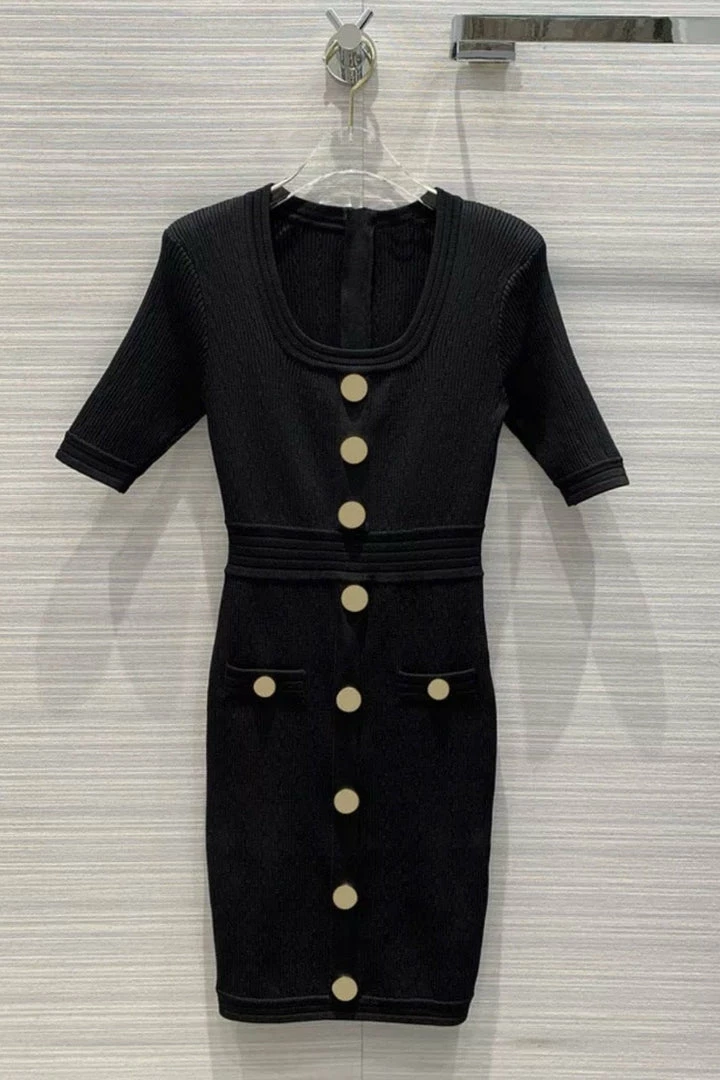 This simple but chic mini is perfect for any occasion. Featuring a knitted fabric with a button embellished front and a mini length. Team this dress with strappy heels and a shoulder bag for a look we’re loving.