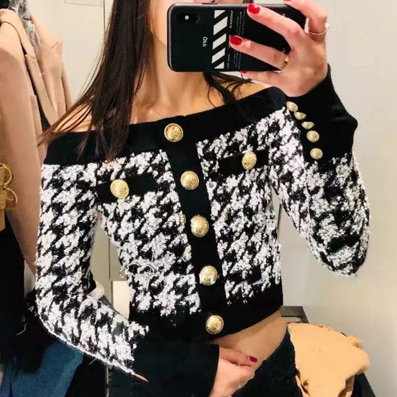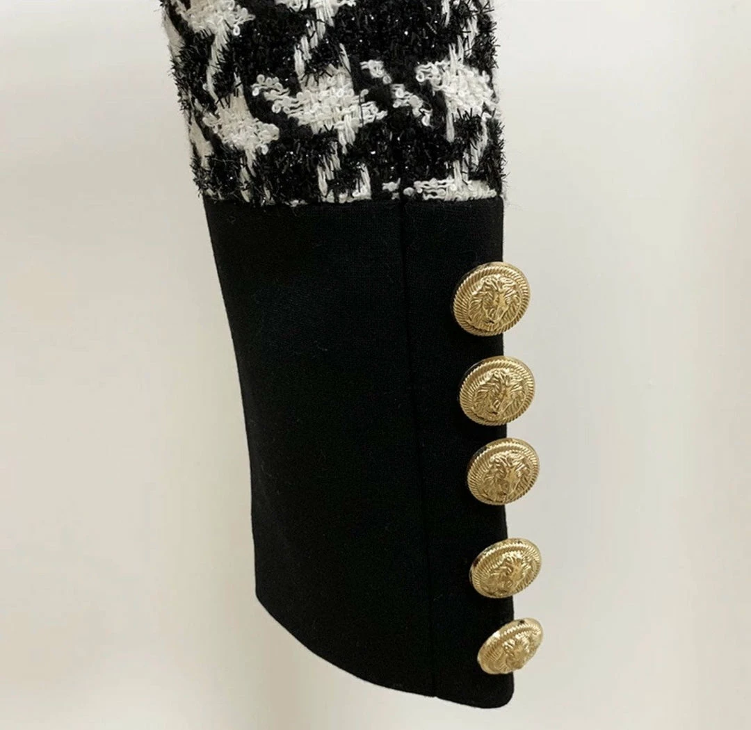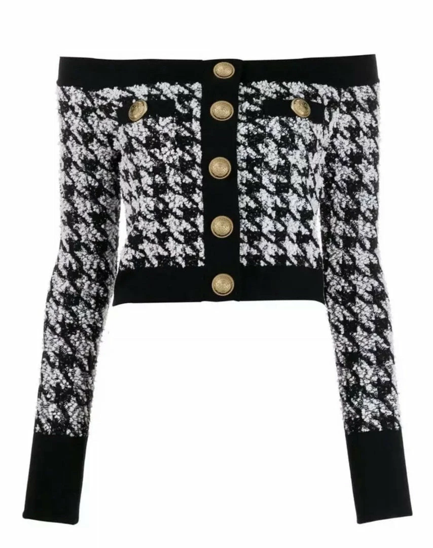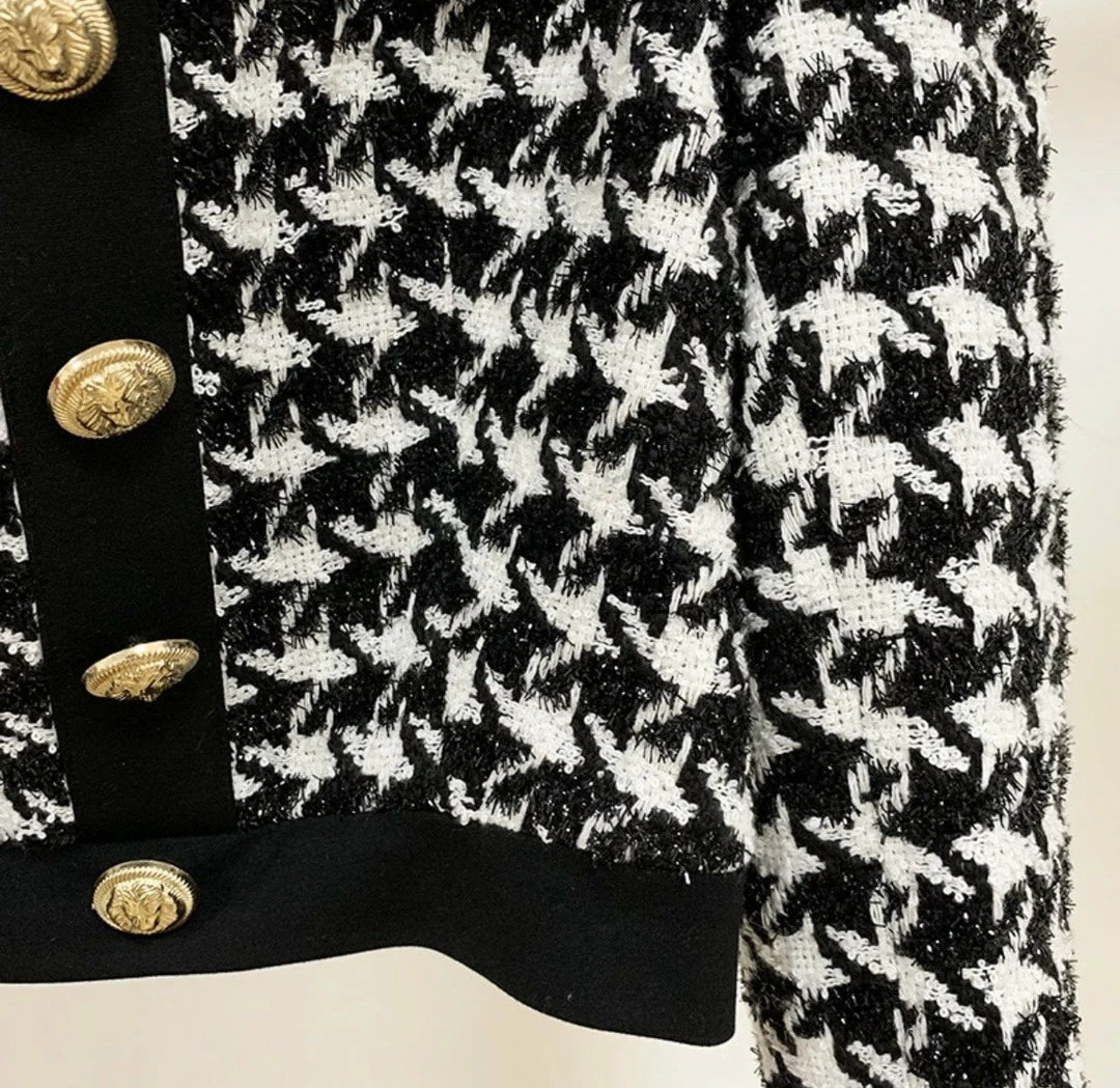 This print is a must-have this season! Featuring a houndstooth print, gold button embellishments, cropped length, and tweed material. Pair with our matching ‘Hayden’ mini skirt!