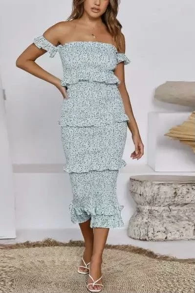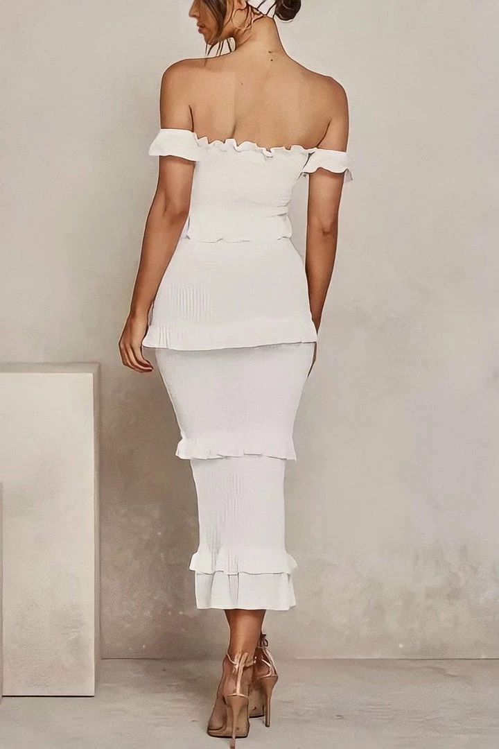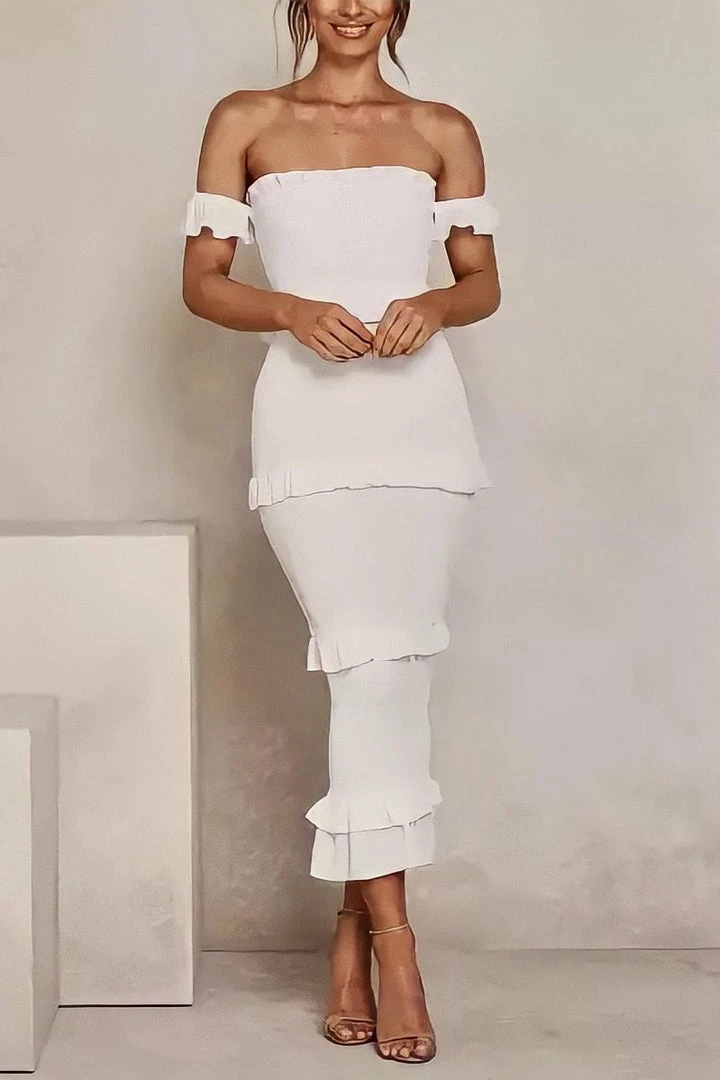 This stunning piece features an off the shoulder style, ruffle details, bodycon fit, and a midi length. Pair with statement earrings and nude heels to complete the look.