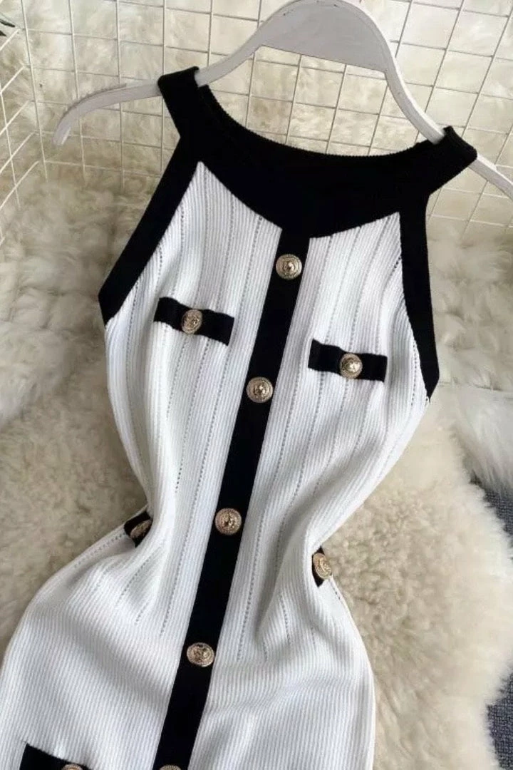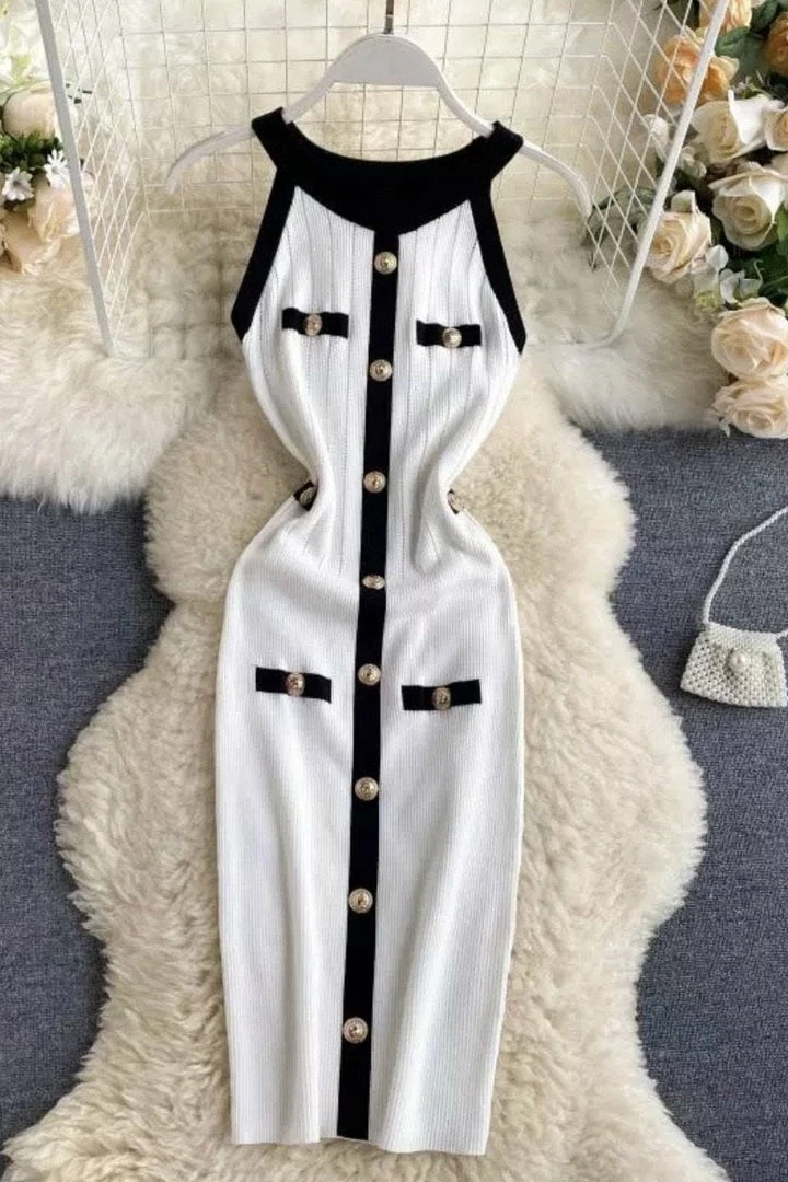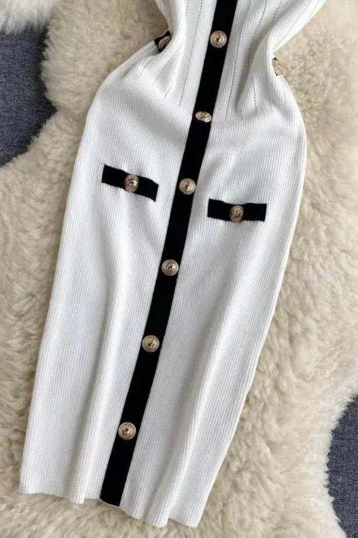 Every doll should have this timeless piece in their wardrobes! Featuring a high neck style, knit material, bodycon fit, gold button embellishments, and a midi length. Pair with pumps and a mini handbag for your next date night lol.