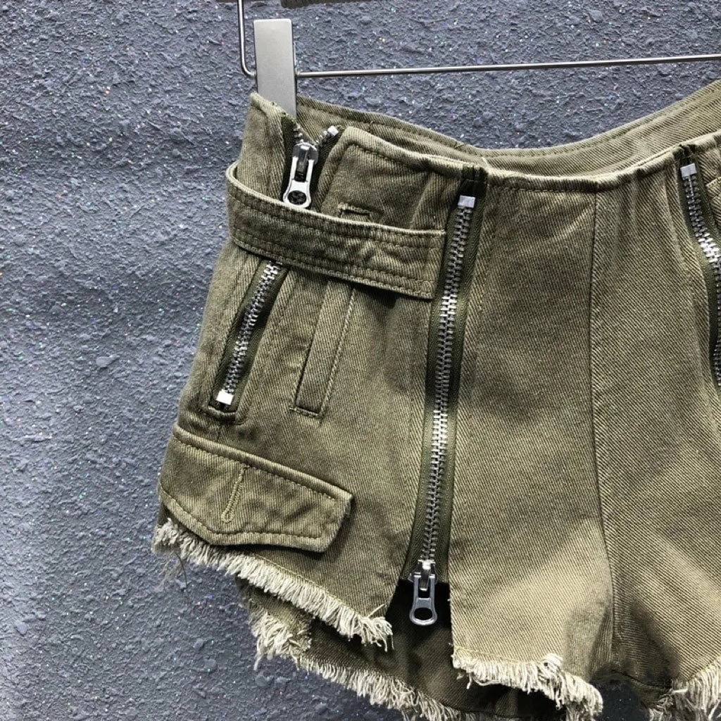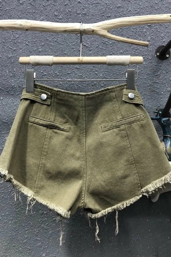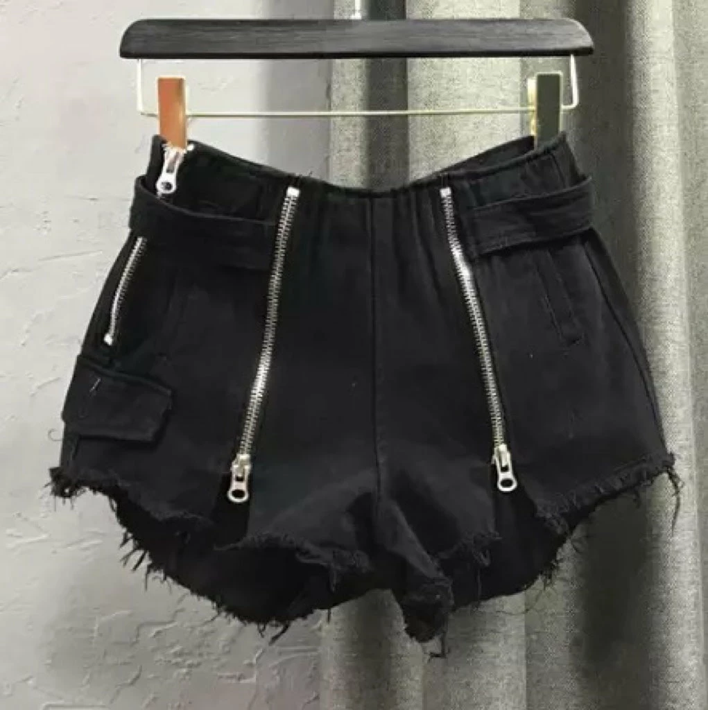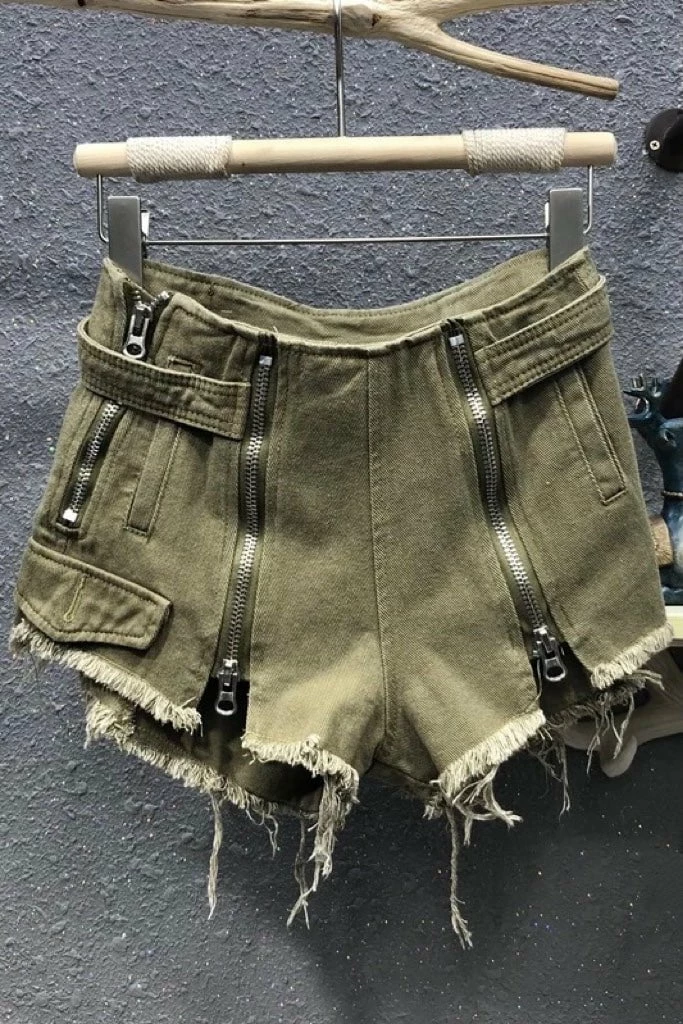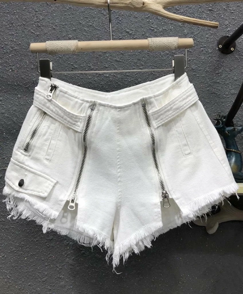 New season means new denim! These shorts feature a high rise fit with zipper detailing along the front and a shredded hem. Style with a tank top and sneakers for an easy summer look.Â