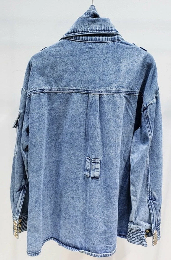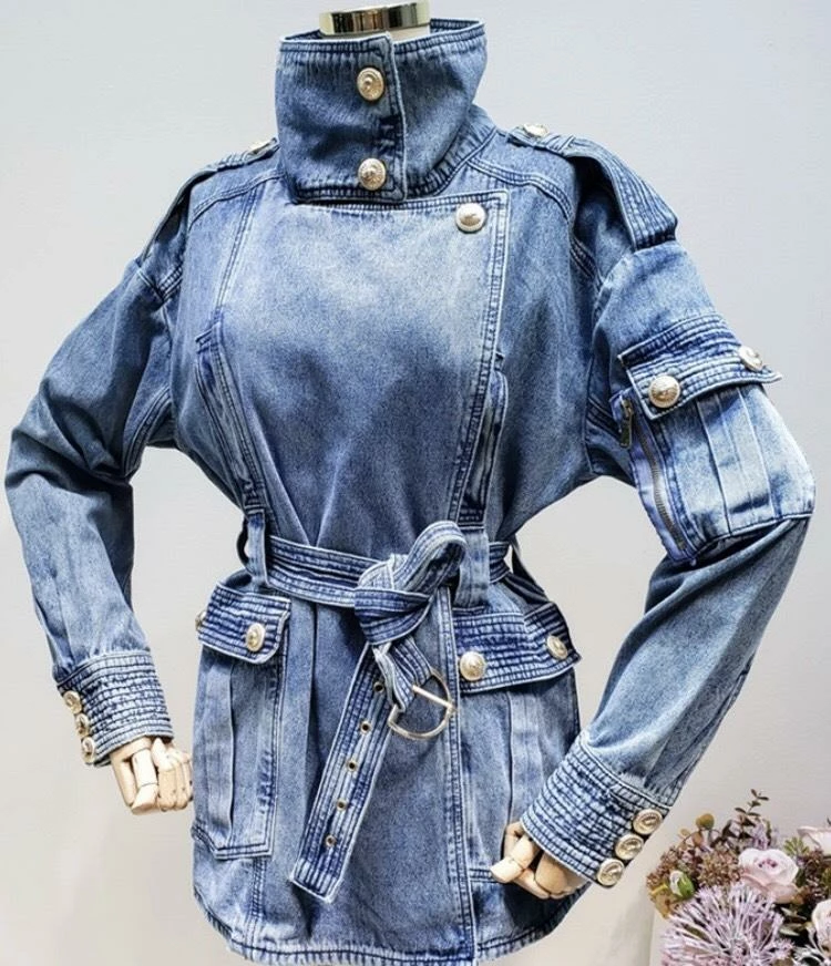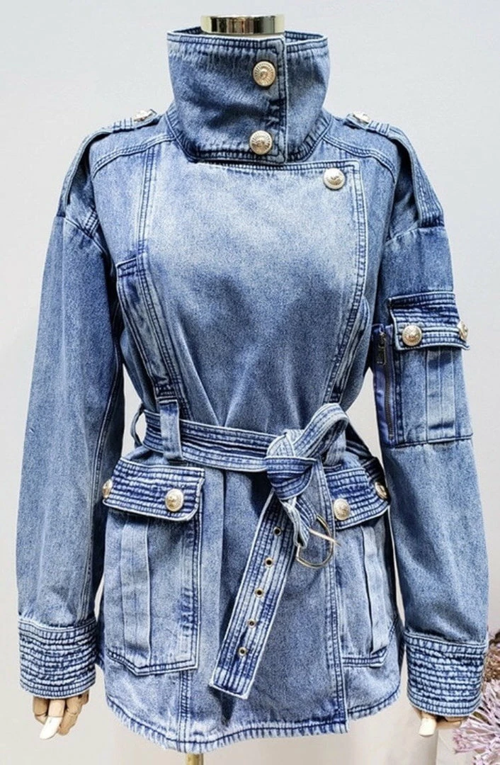 Update your denim jacket look with our luxe ‘Jayden’ jacket! Featuring a high neck, gold button embellishments, adjustable belted waist, and pockets.