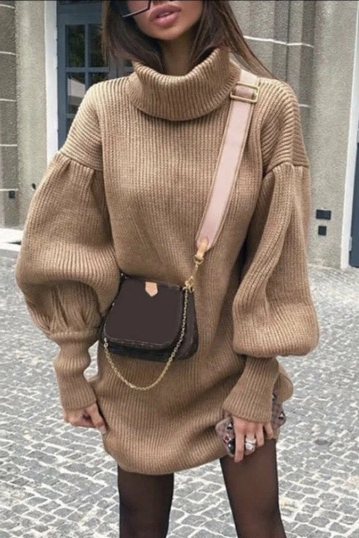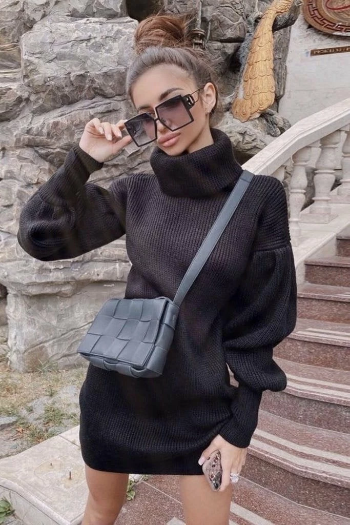 Look adorable this fall/winter season in this gorg dress! Featuring a high neck, long balloon sleeves, knit material, and a mini length.