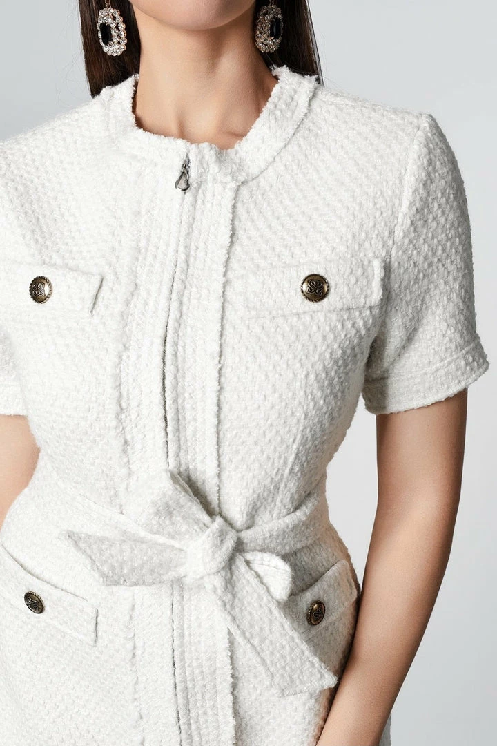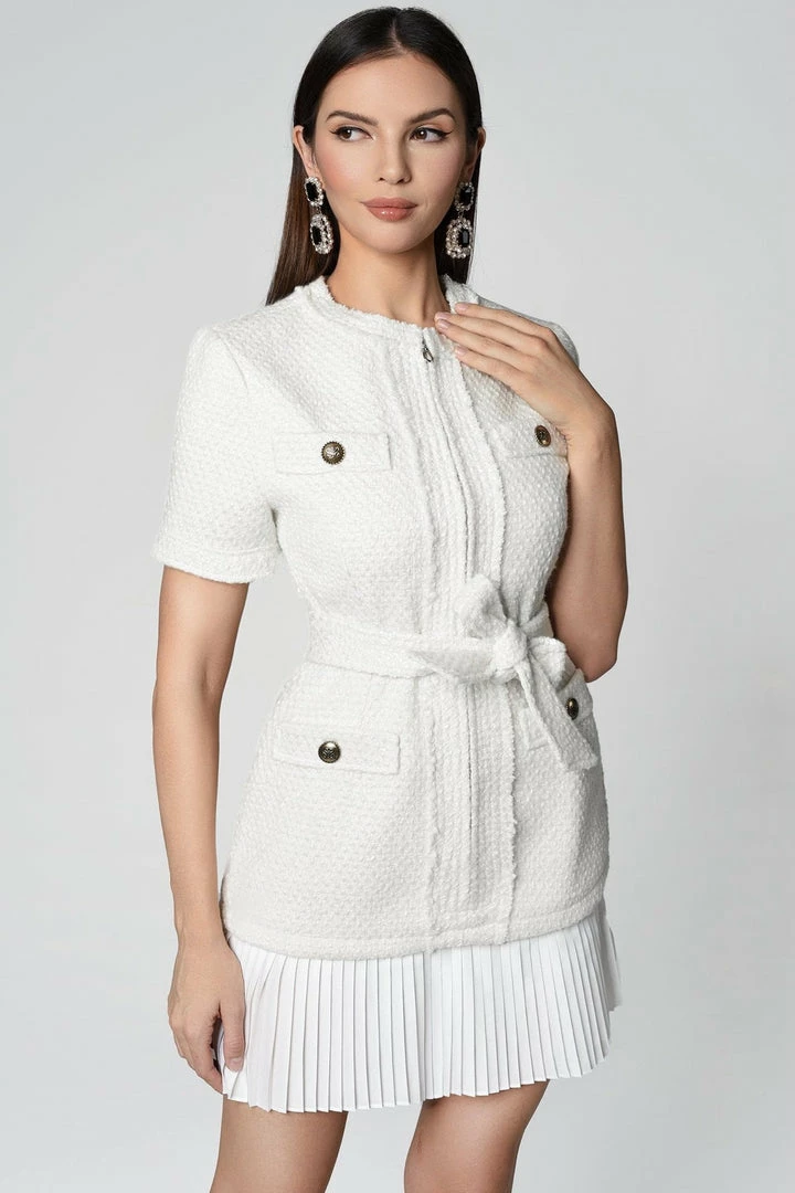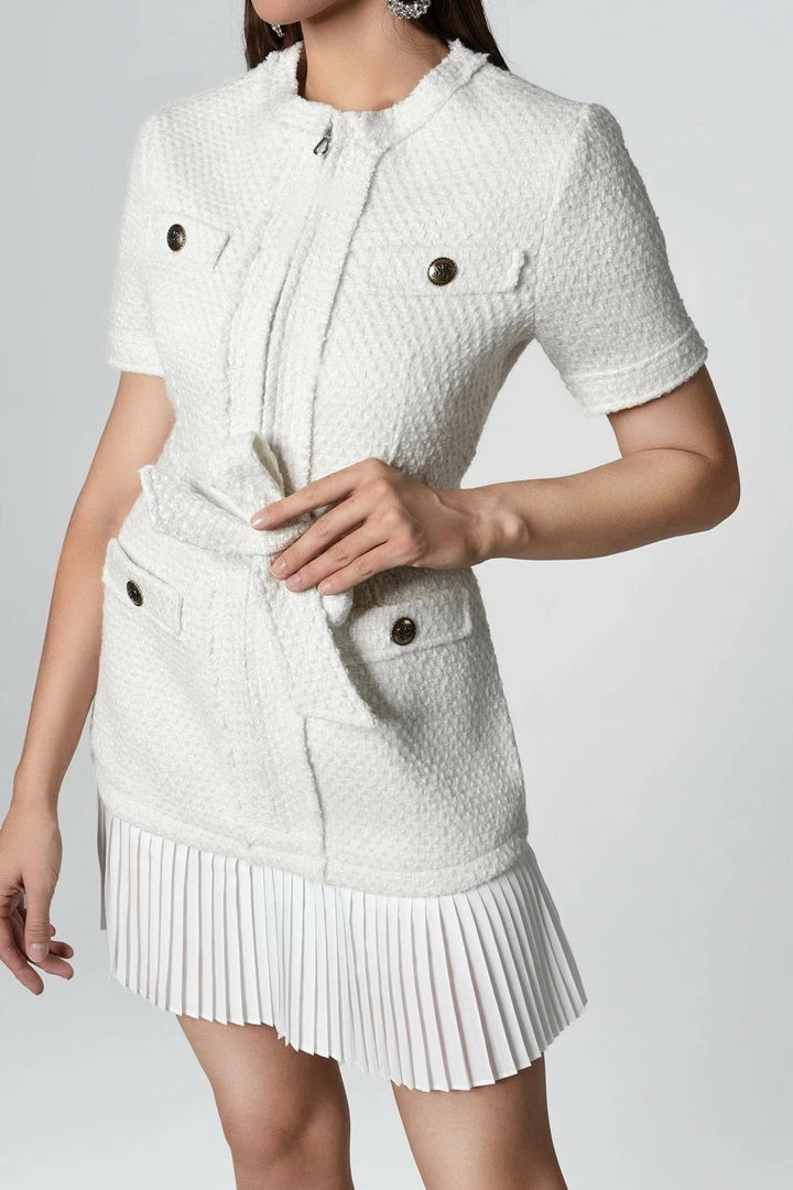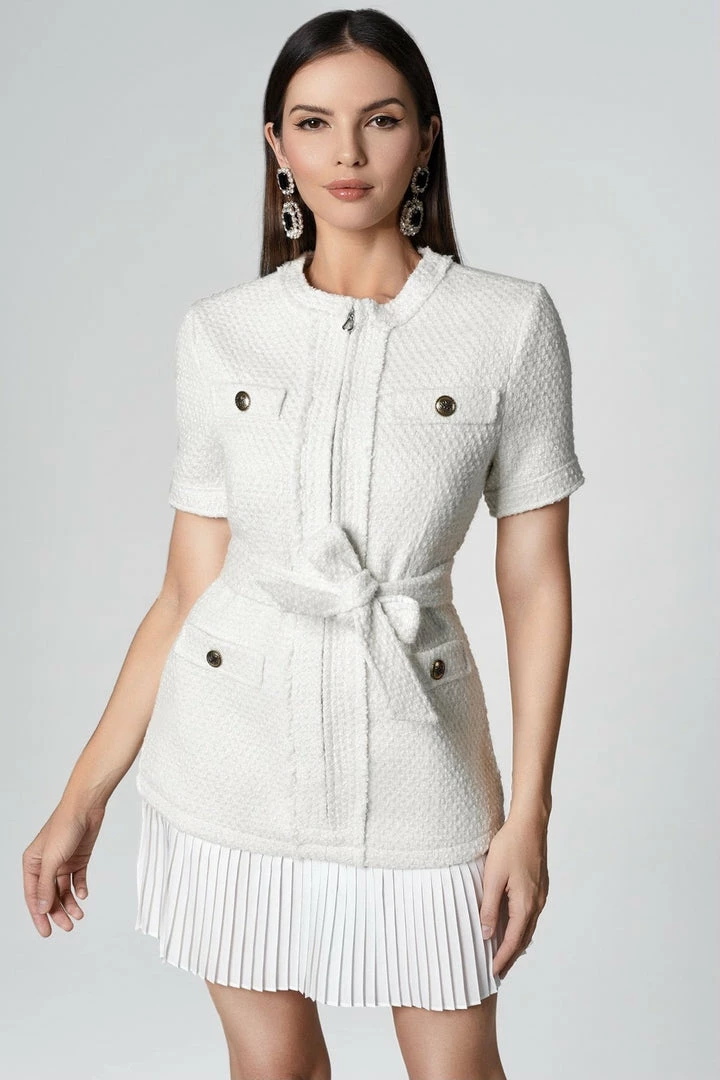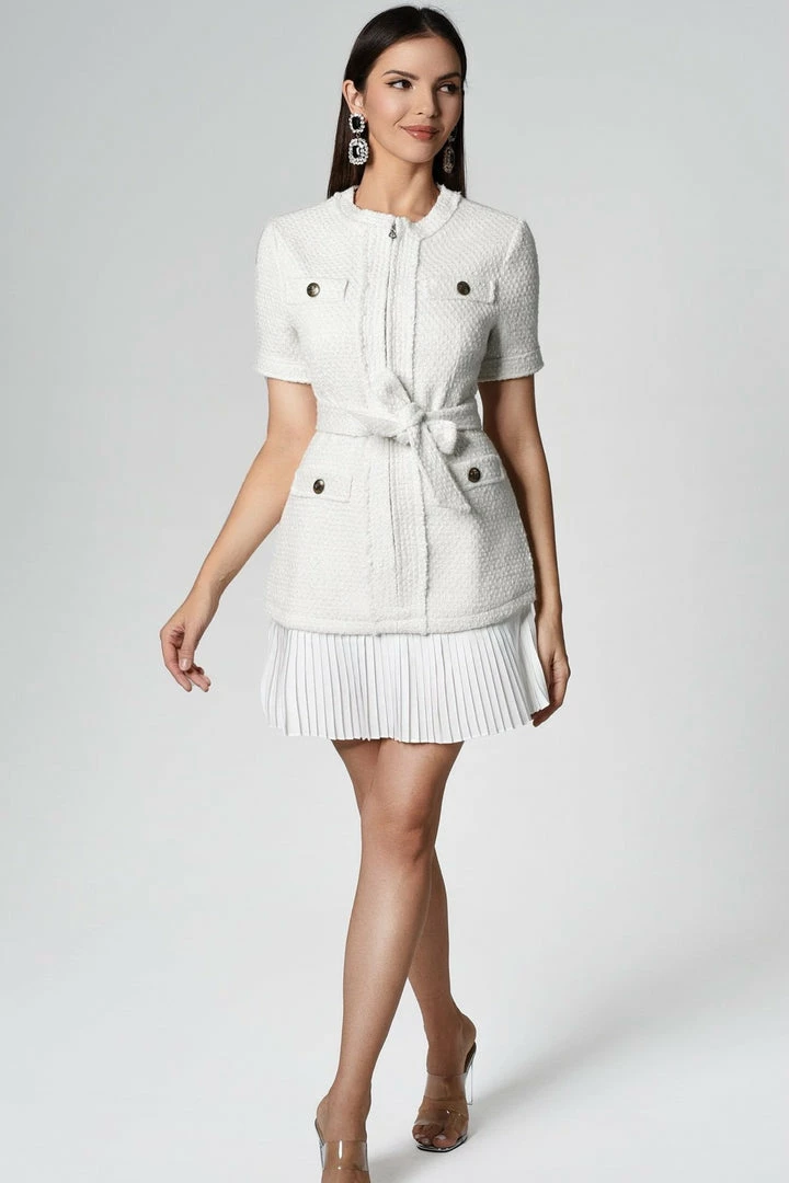 Perfect for an everyday, stylish look. This adorable mini features short sleeves, a tweed material, a pleated hem, a front zipper enclosure, and a belt to synch in your waist. Pair with long earrings and boots for a quickly cool look we’re loving this season.