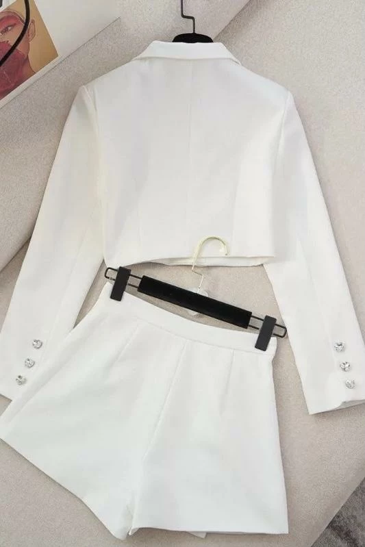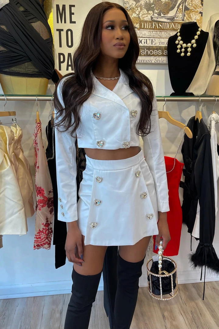 This two piece is this season’s must have dolls! Featuring along sleeve double breasted blazer with silver crystal heart shaped buttons and a matching high waisted skort. Team with a headband and knee high boots.