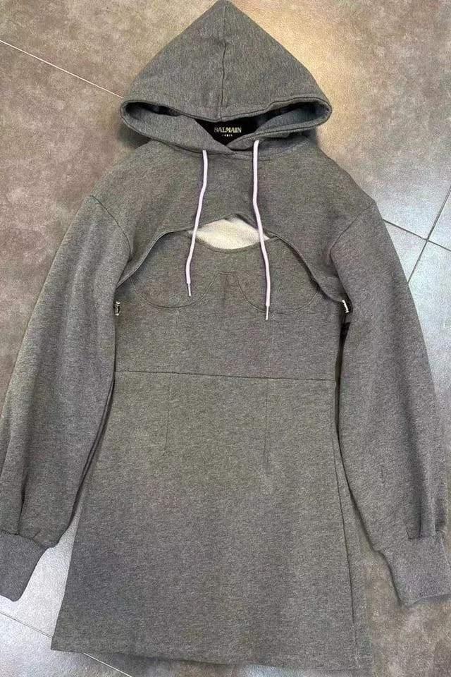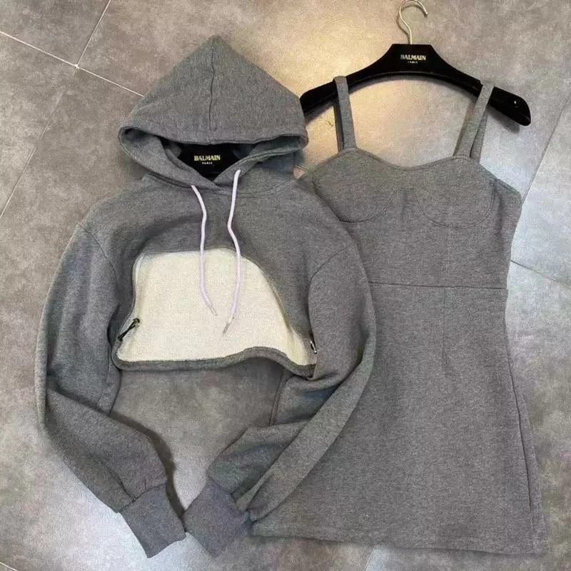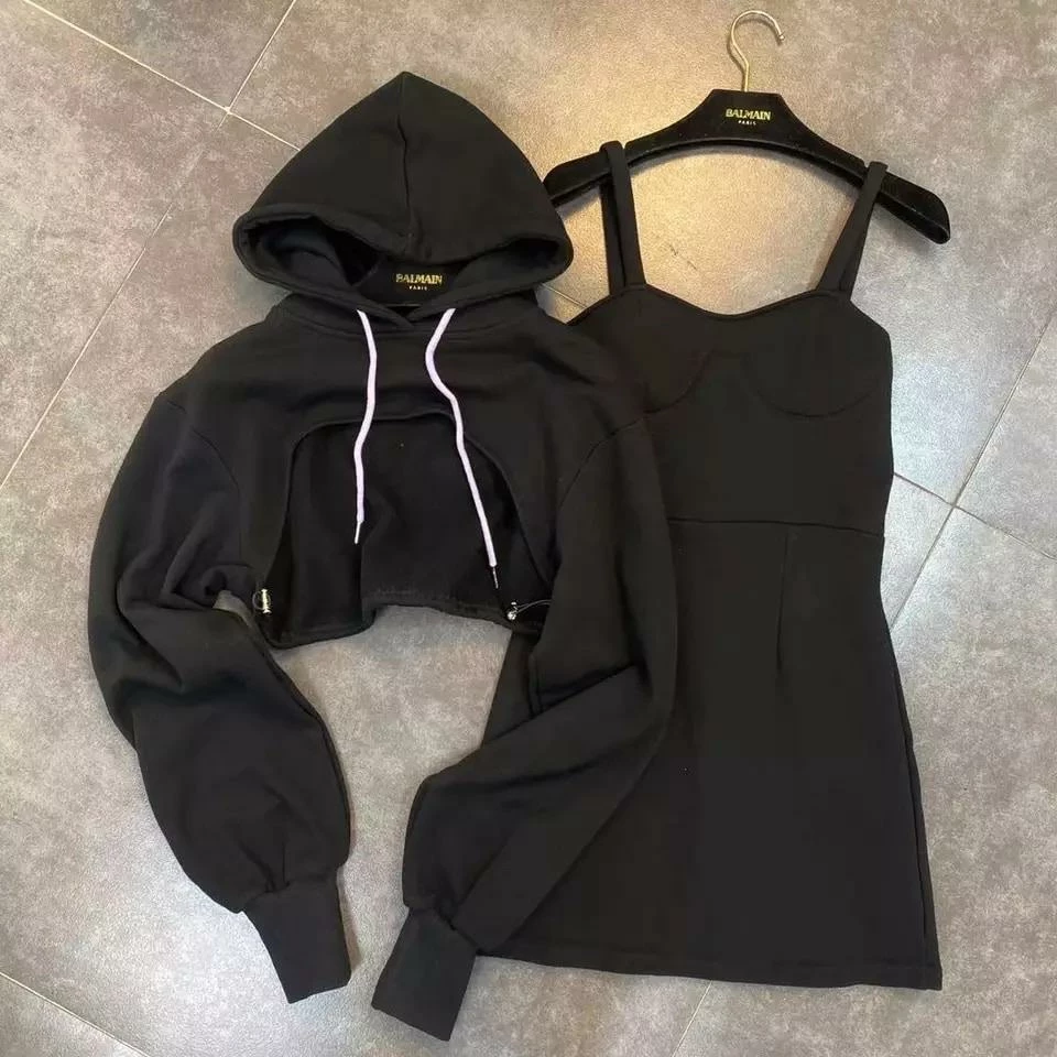 Whether it is loungewear or streetwear, this set can follow you anywhere! This thin strap mini dress is accompanied by an ultra crop matching long sleeve hoodie. Pair with sneakers and chunky socks to run errands or knee high socks to stay cute from home.
