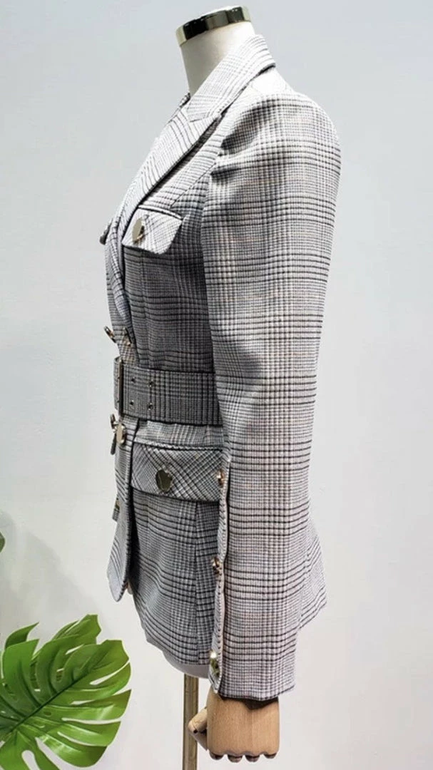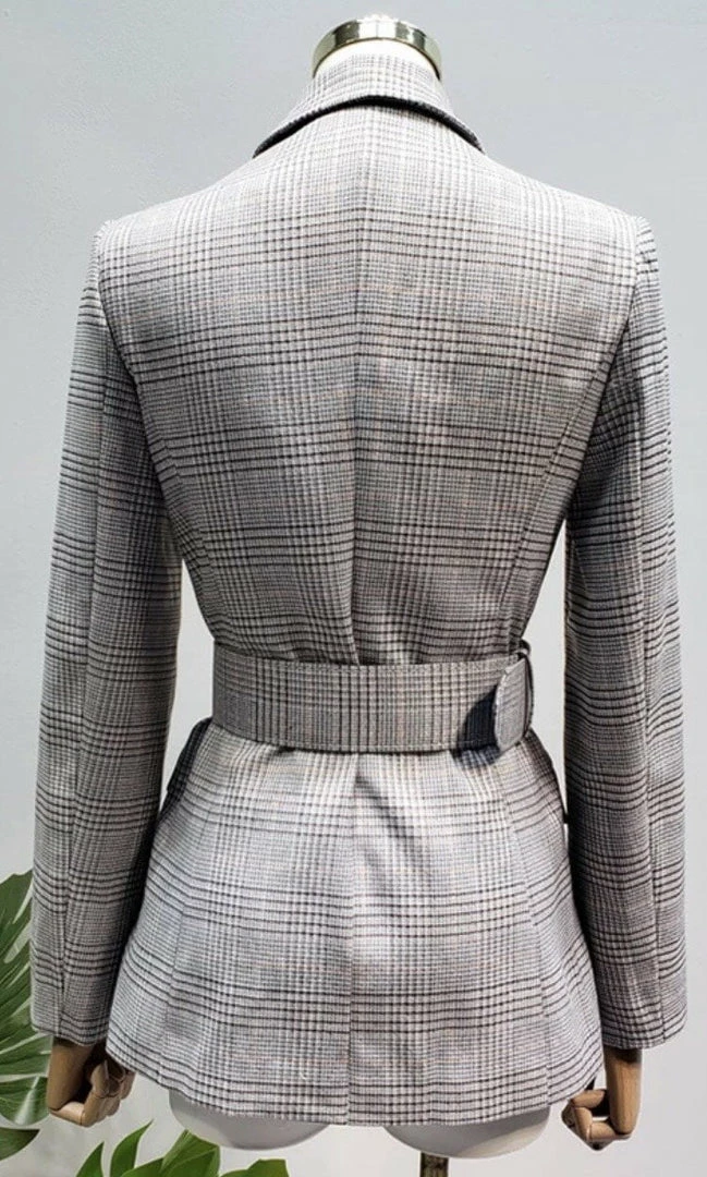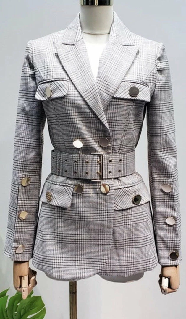 Get that chic, classy style with ease in this blazer. Featuring a grey checked material, gold button embellishments, pockets, double breasted fit, and belted waist. Pair with some light wash jeans and heels for brunch with your babes.
