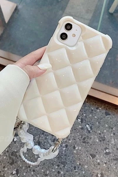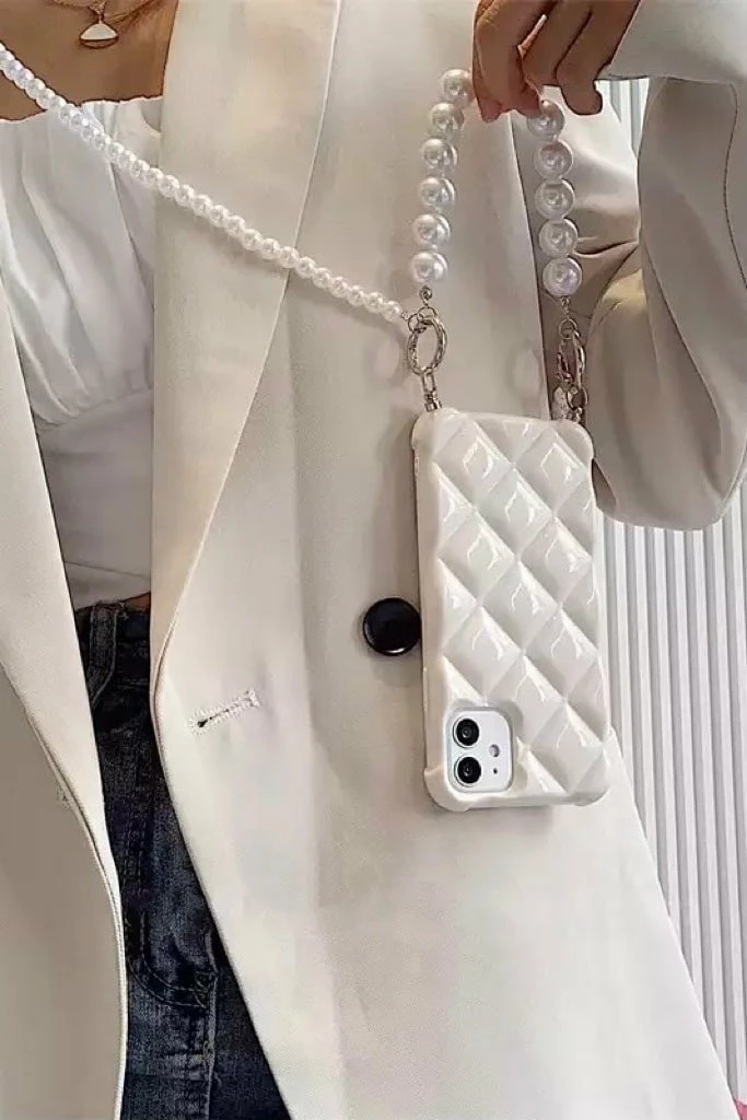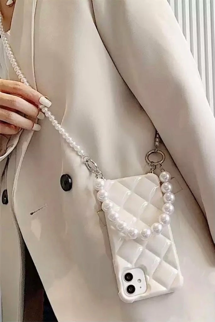 Add the extra glam element! This quilted phone case includes two multi-size detachable pearl straps to carry your phone in style.