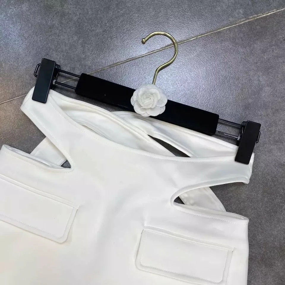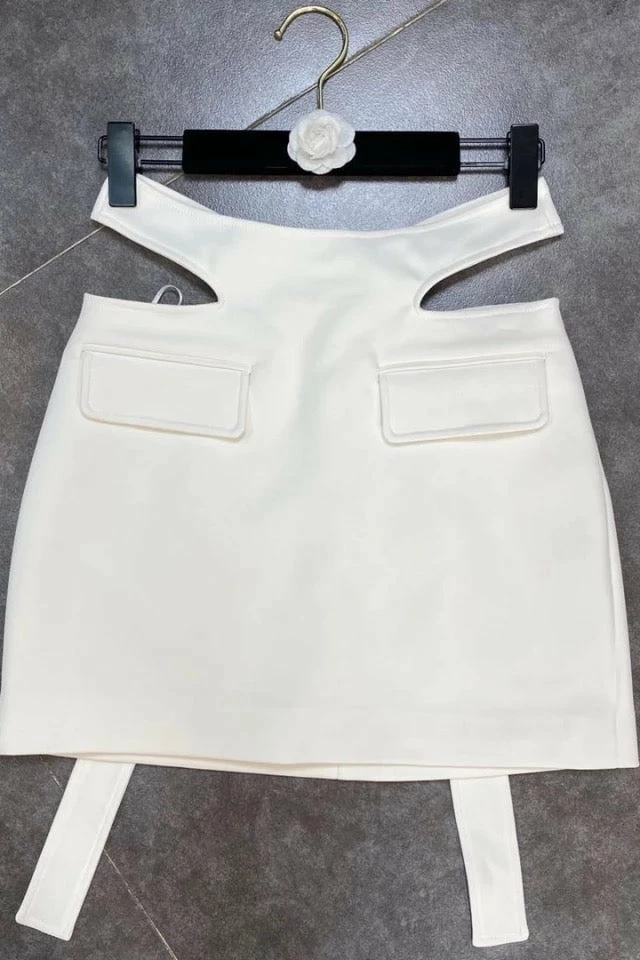 Go mini or go home this season! Featuring the trending mini skirt style with a high rise strap, hip cut outs, and two faux pockets on the front. Style with a matching white crop top and strappy heels on your next girls night out!