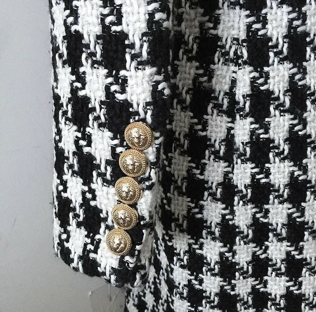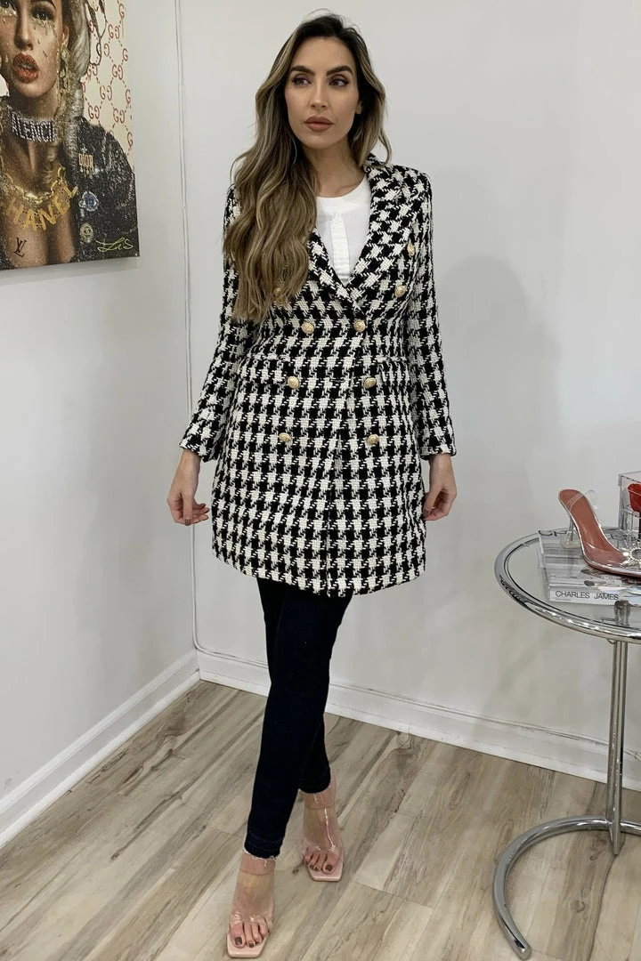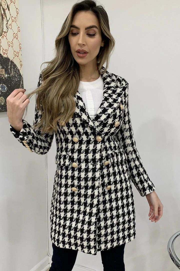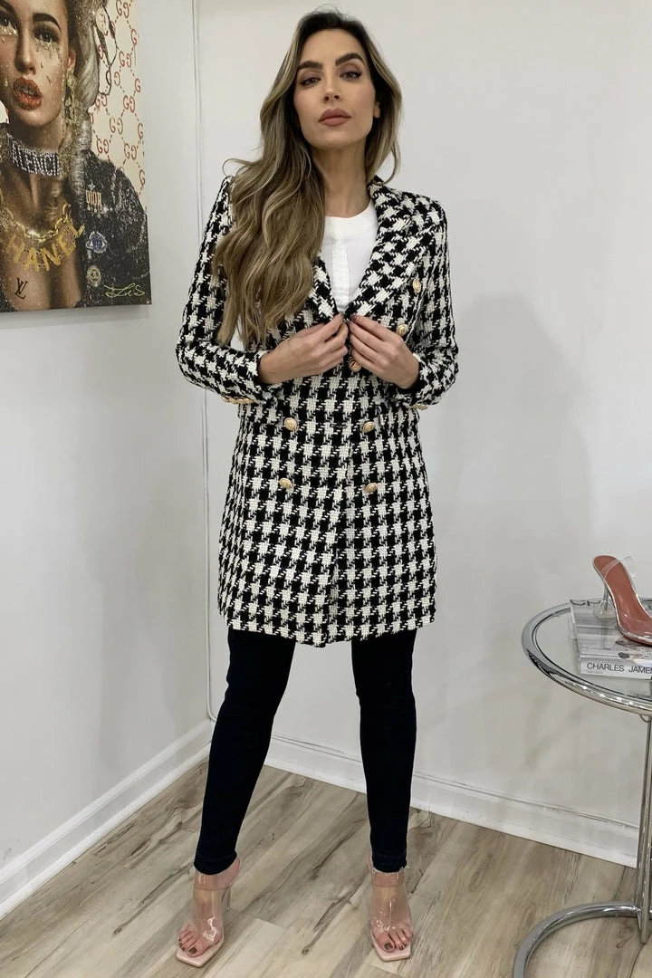 Beat the cold effortlessly with our ultra chic and sophisticated ‘Shasta’ coat. Able to elevate any casual tee and leggings ensemble, the coats features a double-breasted design, gold button detailing, cozy wool material, and a classic monochromatic houndstooth check pattern.
