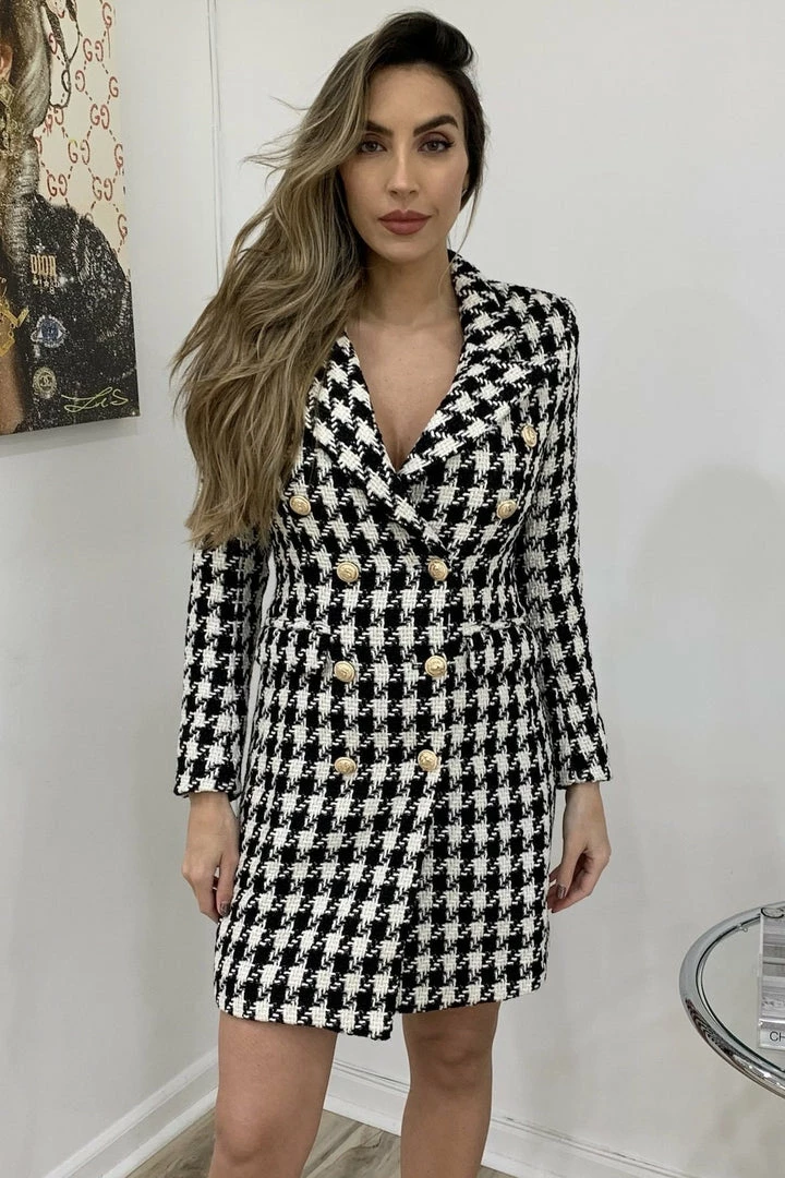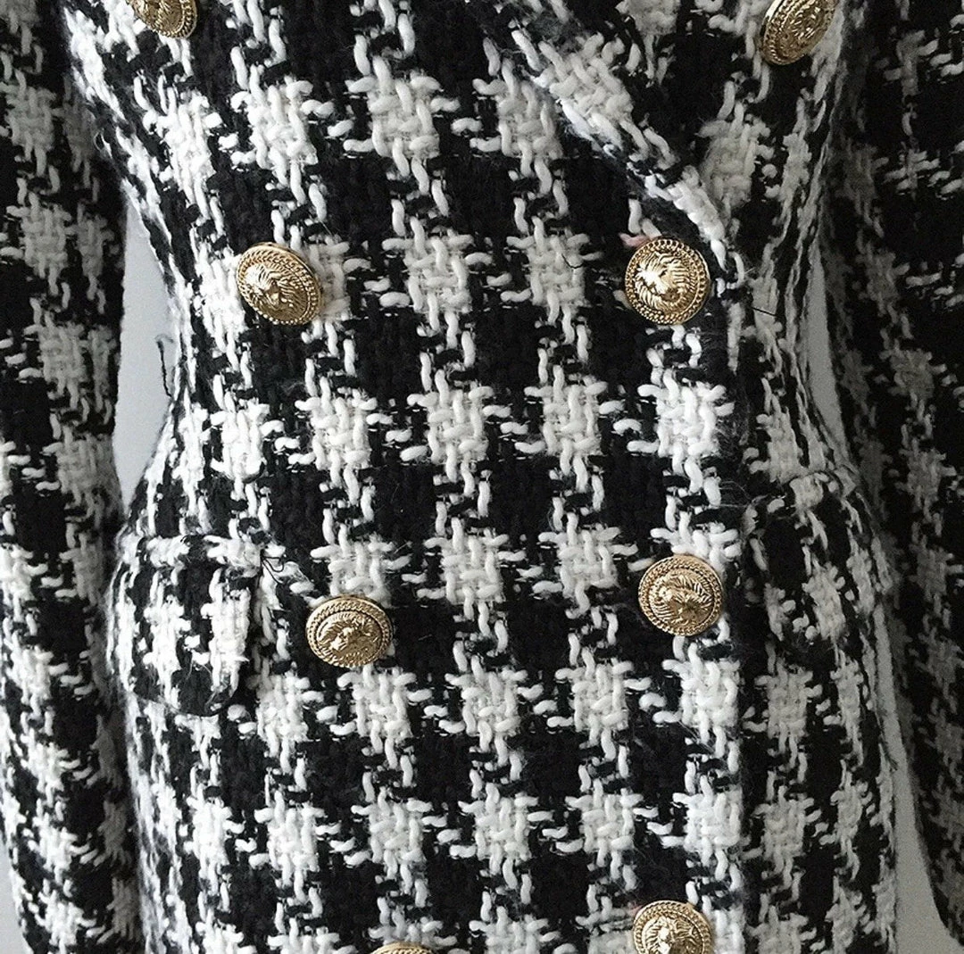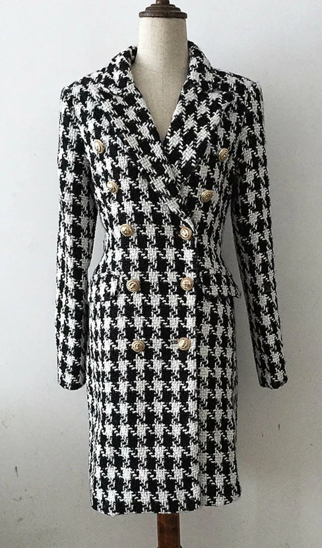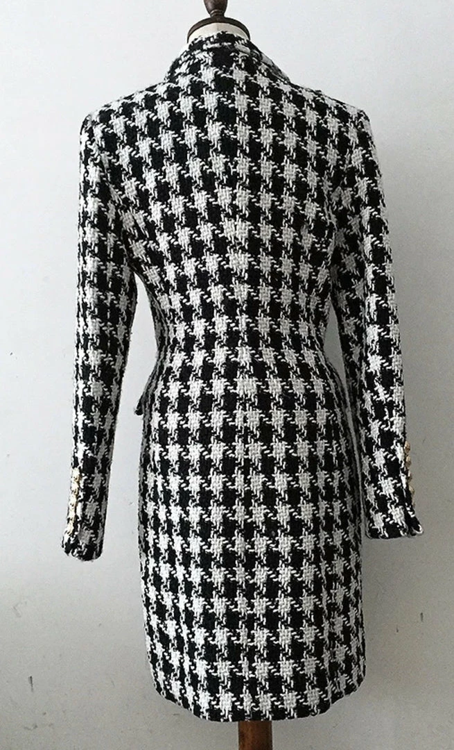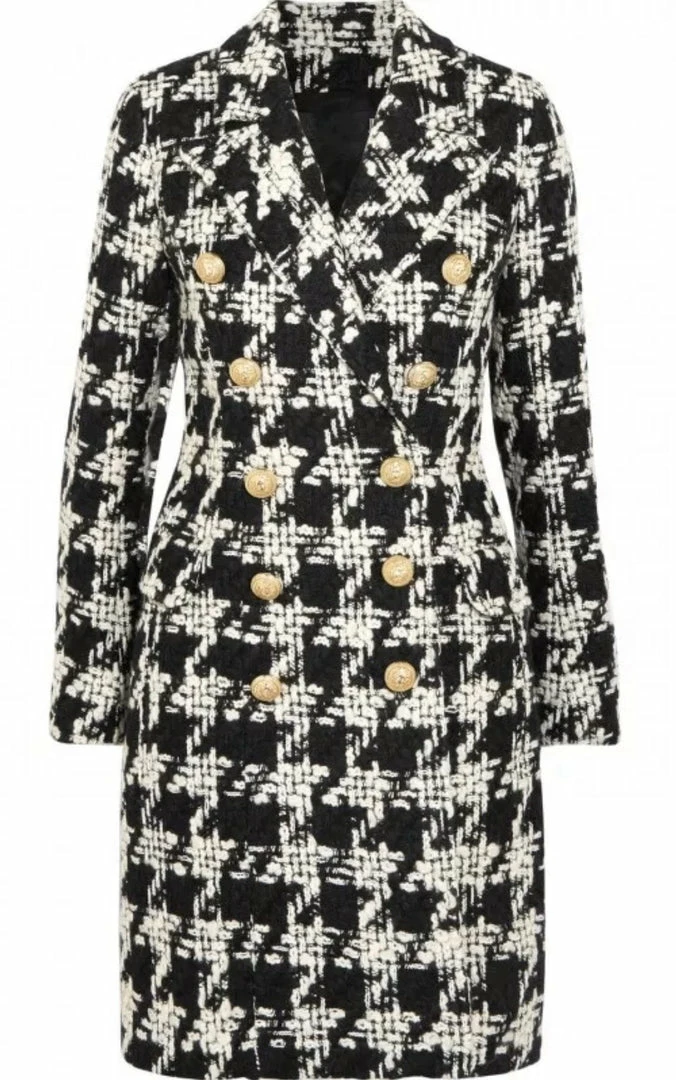 Beat the cold effortlessly with our ultra chic and sophisticated ‘Shasta’ coat. Able to elevate any casual tee and leggings ensemble, the coats features a double-breasted design, gold button detailing, cozy wool material, and a classic monochromatic houndstooth check pattern.