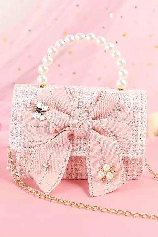 Go for the darling look! This micro bag features a tweed material, a pearl strap, a long, gold chain strap, and a bow detail. Pair perfect with any of your spring/summer looks!