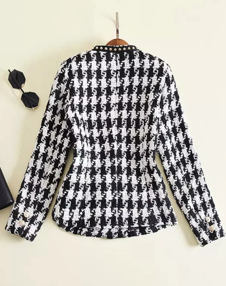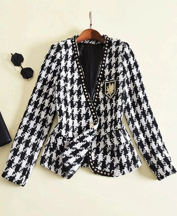 Able to elevate any casual tee and leggings ensemble, our ‘Tweety’ blazer is a wardrobe must-have. Including a houndstooth pattern, gold studs, one button closure, patchwork design, and 2 buttons on the sleeves.