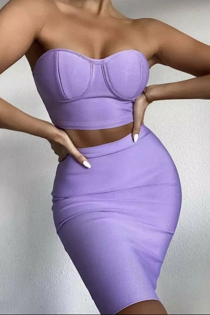 This set is complete with a midi bandage skirt and an ultra cropped strapless top with a sweetheart neckline. Pair with your favorite necklace and cute jacket for the ultimate going out look!