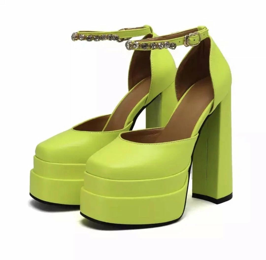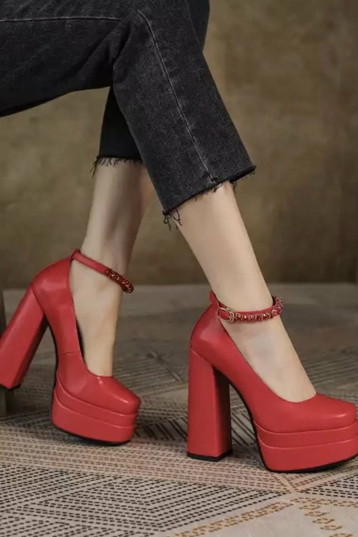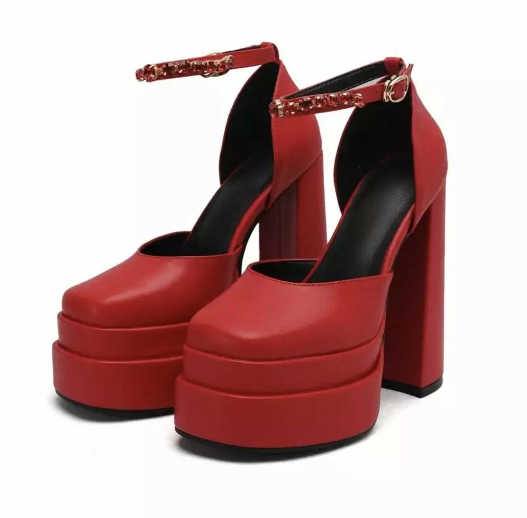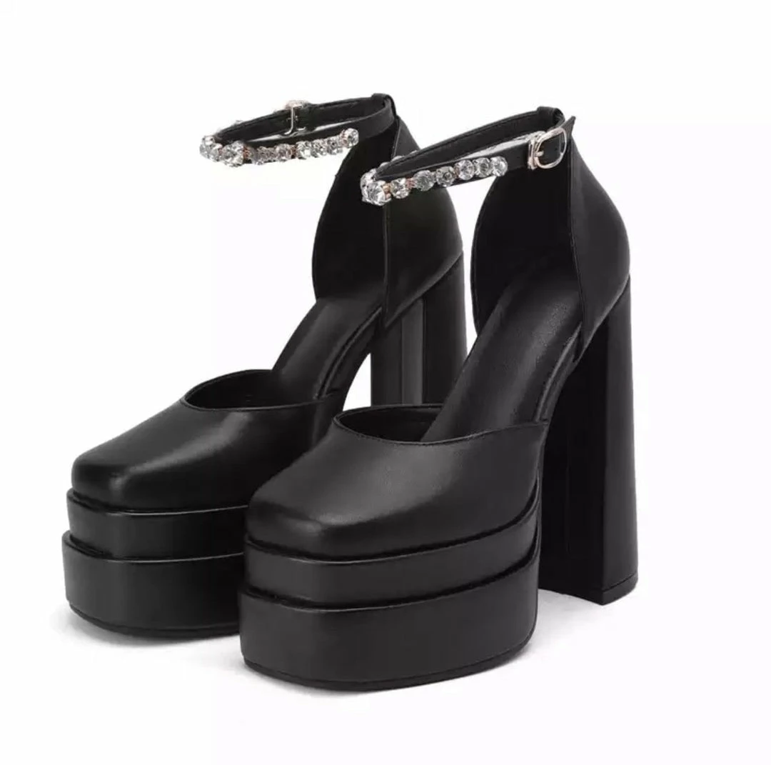 A chunky platform heel is a must in every dolls closet. Featuring a leather platform heel with rhinestone ankle straps and a leather material. Pair with patent leather leggings and a killer top to make heads turn when you walk in the room!